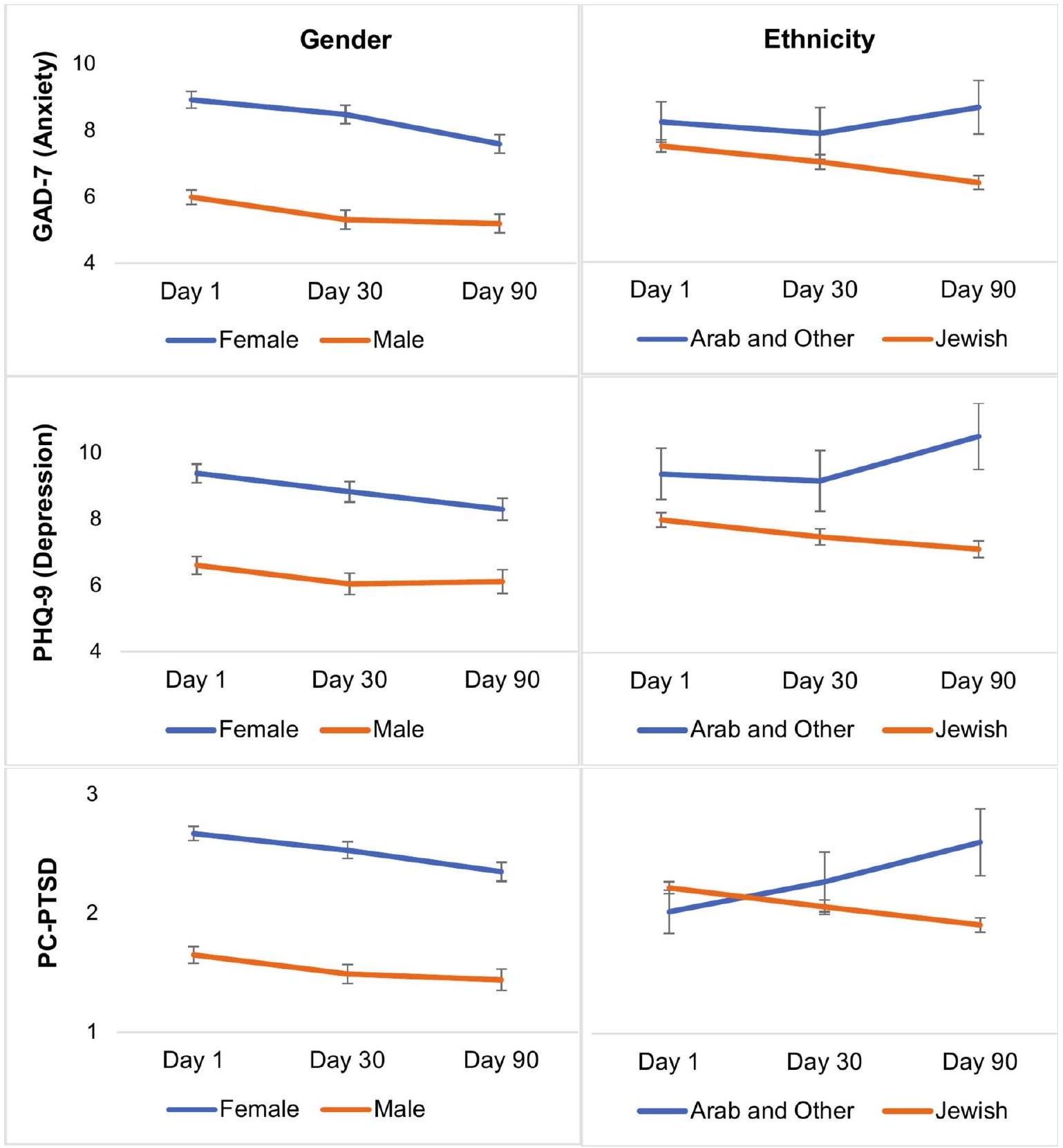 Fig. 2. Generalized Anxiety Disorder-7 (GAD-7), Patient Health Questionnaire-9 (PHQ-9), and the Primary Care PTSD (PC-PTSD) Scores by Gender and Ethnicity. Notes: Arab ( ) and Other: Druze ( ), Russian ( ), Christian ( ), no religion ( ), unspecified ( ); GAD-7, Generalized Anxiety Disorder; PHQ9, Patient Health Questionnaire; PC-PTSD, Primary Care PTSD Screen for DSM-5. Linear Mixed Models: F values ranged from 8.3 to 213.9, with p ranging from .004 to < . 001 .