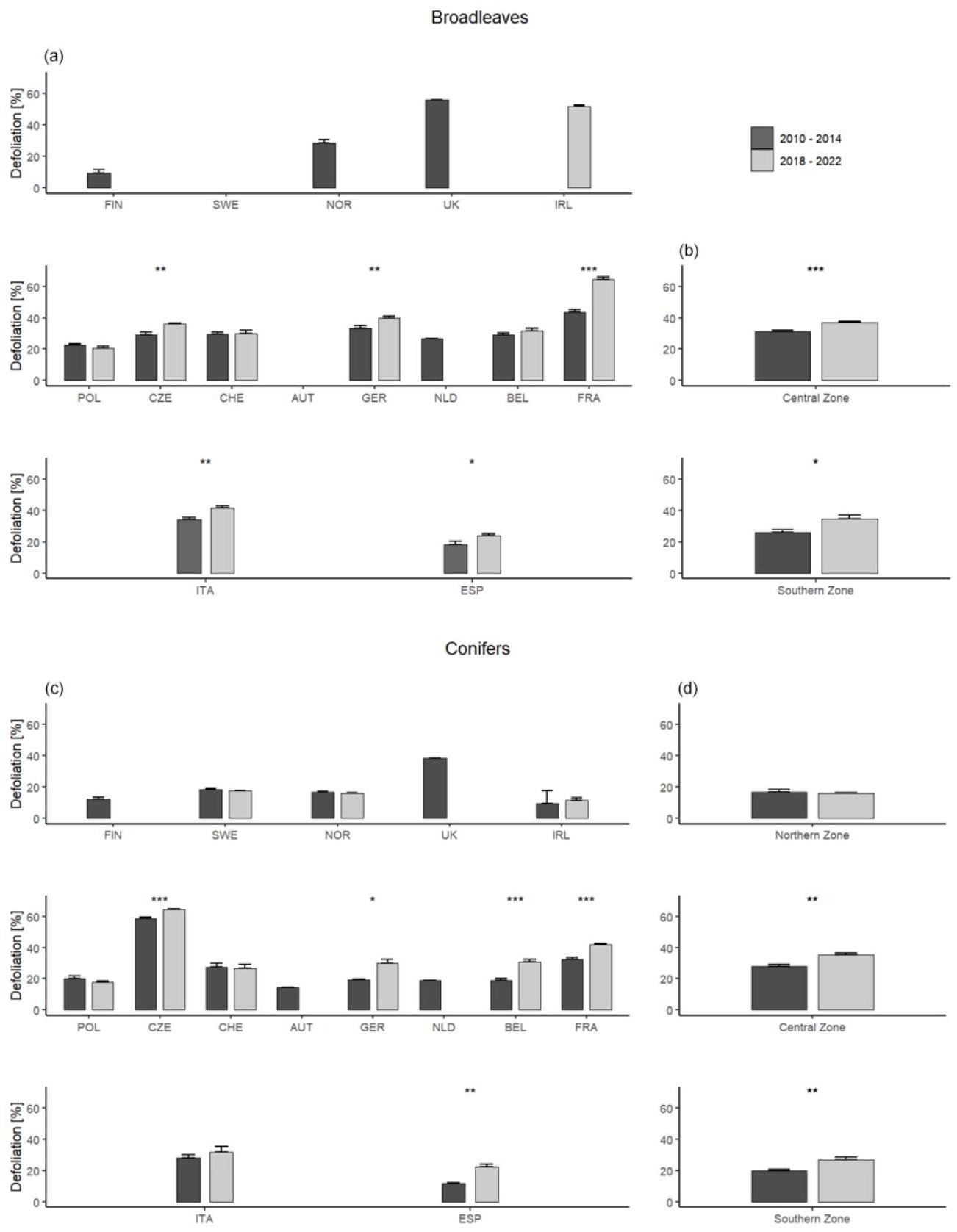 the data indicate potential vulnerability to future drought impacts, highlighting the need for ongoing monitoring and conservation efforts. It is important to note that the lack of data on crown defoliation for broadleaves limits a comprehensive assessment of the situation.