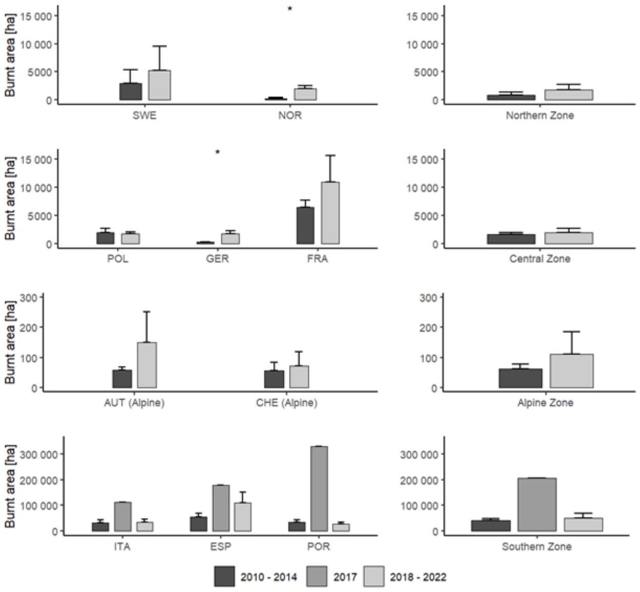 age spanning 2018-2022, the exceptional forest fire damage in 2017 in southern Europe was also included to provide context for subsequent damage. Post-2017, significant management measures were implemented in southern Europe to mitigate forest fires, affecting subsequent damage trends (e.g. REA, 2024). Forest damage in other zones is not discussed for 2017 as it was comparatively minimal.