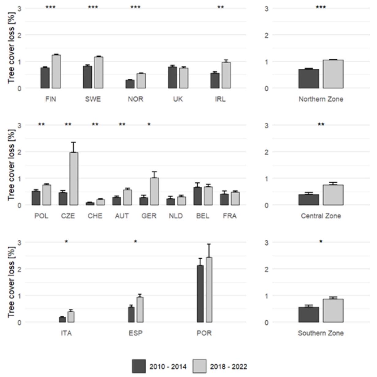 area during 1996-2021 compared to 1971-1995 (Turco et al., 2023). In the western United States, climate change and other factors have doubled the cumulative forest fire area since 1984 (Abatzoglou and Williams, 2016). Global projections for the 21st century suggest that climate change will worsen fire weather conditions, affecting a significant portion of the burnable land worldwide (Abatzoglou et al., 2019). The significant disparities in TCL observed across European regions between the dry period of 2018-2022 and the reference period of 2010-2014 highlight the complex interactions between human activities, natural phenomena, and climate change, emphasising the importance of comprehensive forest management strategies to mitigate the impacts of environmental changes on forest ecosystems. The escalating frequency and intensity of extreme weather events such as storms, droughts, and wildfires pose significant threats to forest health and resilience. However, forests are under increasing pressure, not only from climate extremes but also from human activities such as logging, deforestation, and urbanisation, underscoring the urgent need for proactive measures to address these challenges. Further research is needed to better understand the specific drivers behind the disparities in reporting and to develop targeted interventions for sustainable forest conservation and management.
