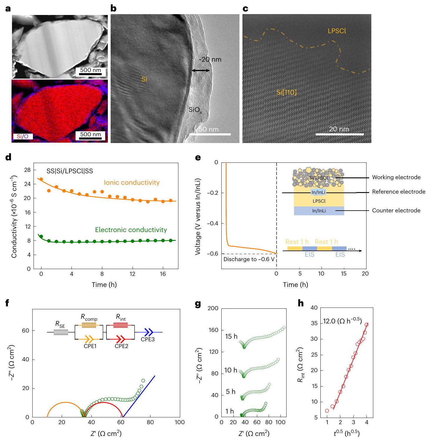 تظهر صورة STEM المفلترة بواسطة طرح الخلفية المتوسطة (الشكل 1c) أنه لم تتشكل أي مراحل بلورية جديدة عند واجهة Si|LPSCl، مما يشير إلى واجهة مستقرة كيميائيًا من خلال الاتصال المباشر، على الرغم من أنه لا يمكن استبعاد الطبقات غير المتبلورة تمامًا (الشكل 1c). نفترض أنويمكن أن تتفاعل LPSCI كيميائيًا على النانو، ومع ذلك لا توجد أدلة واضحة على تكوين منتجات تفاعل قبل الليثiation للسيليكون (الشكل التكميلي 4). لمزيد من التحقيق في استقرار مركبات Si/LPSCI النقية وأيون/إلكترون تم تطبيق النقل عبر الطيف الترددي الكهربائي المعتمد على الزمن (EIS) على أساس إعداد خلية من الفولاذ المقاوم للصدأ SS|Si/LPSCI|SS (قياس واحد كل ساعة) (الشكل التوضيحي التكميلي 5a). تم استخدام نموذج خط النقل لتناسب المقاومات وتقسيم المساهمات الأيونية والإلكترونية في المزيج.مركب (الشكل التوضيحي التكميلي 5ب والجدول التكميلي 1)الموصلية الأيونيةمن المركبينخفض منإلىبعد 17 ساعة، في حين أن الموصلية الكهربائيةيبقى مستقراً نسبياً عندبعد 17 ساعة. يظهر انتشار العناصر الواجهة تأثيرًا أكبر على الموصلية الأيونية مقارنةً بالموصلية الإلكترونية للمركب. (الشكل 1د).