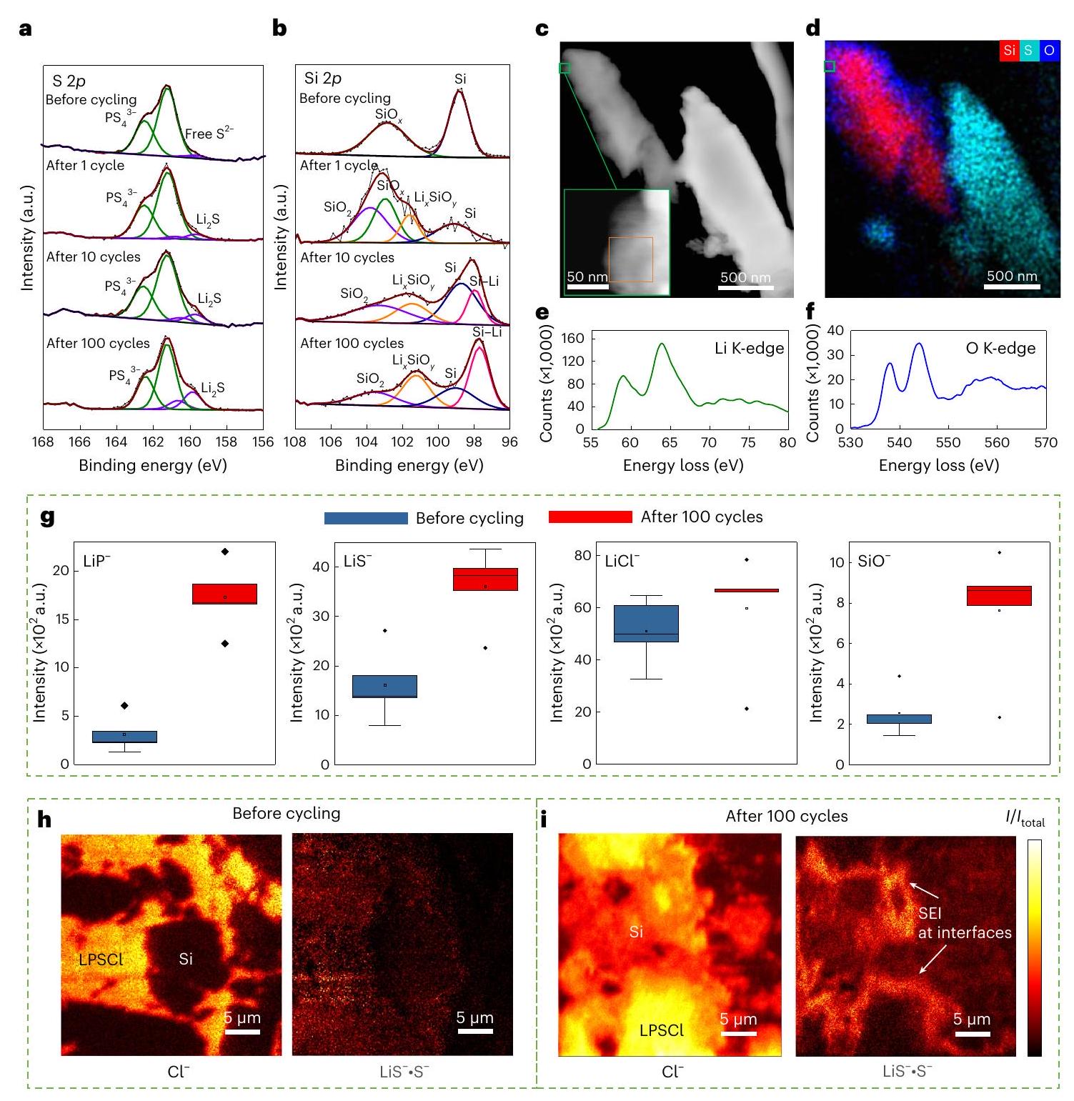 Fig. 2 | Characterization of SEI components at Si|LPSCI interfaces. a,b, S2 (a) and Si2 (b) XPS spectra of Si|LPSCI before cycling and after different cycles.c.d, HAADF cryo-STEM image (c) and corresponding EDS mapping (d) of Si/LPSCI after 100 cycles. e,f, Li K-edge (e) and O K-edge (f) EELS spectra of Si/LPSCl after 100 cycles. The orange box in the inset in c encloses the region from which EELS spectra were obtained. g, Box plots of SEI-related signal intensities (that is, , and ) from ToF-SIMS surface analyses of before and after 100 cycles. The SEI-related signal intensities were normalized by the S signal