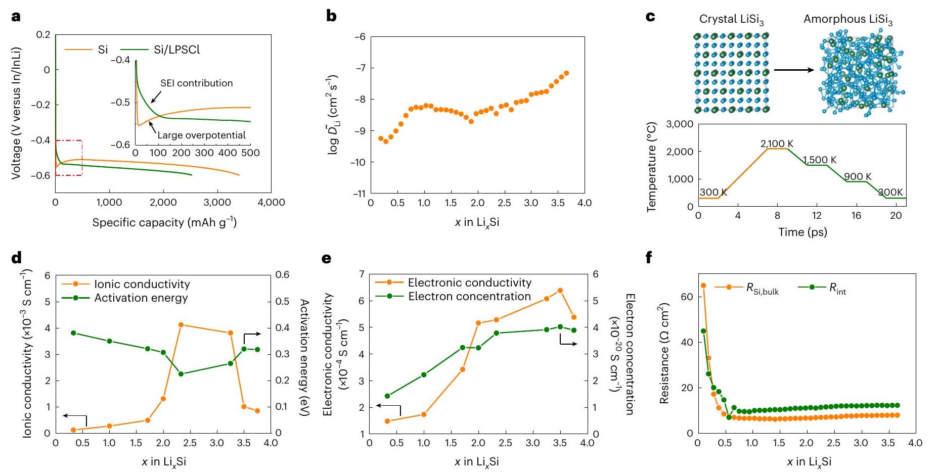 Fig. 3 | Ion/electron transport in SE-free Si anodes. a, Lithiation curves of the SE-free Si and Si/LPSCl anodes at 0.1C.b, Lithium chemical diffusion coefficient of the alloys for different SoCs.c, Simulated crystal and amorphous structures before and after the melt-and-quench process. d, Simulated ionic