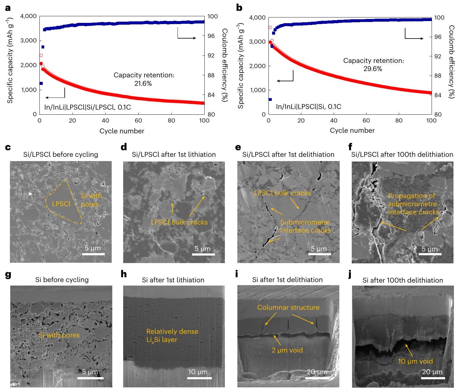 after the 100th delithiation (f). g-j, Cross-sectional SEM images of the SE-free Si anode before cycling (g), after the first lithiation (h), after the first delithiation (i) and after the 100th delithiation (j).
