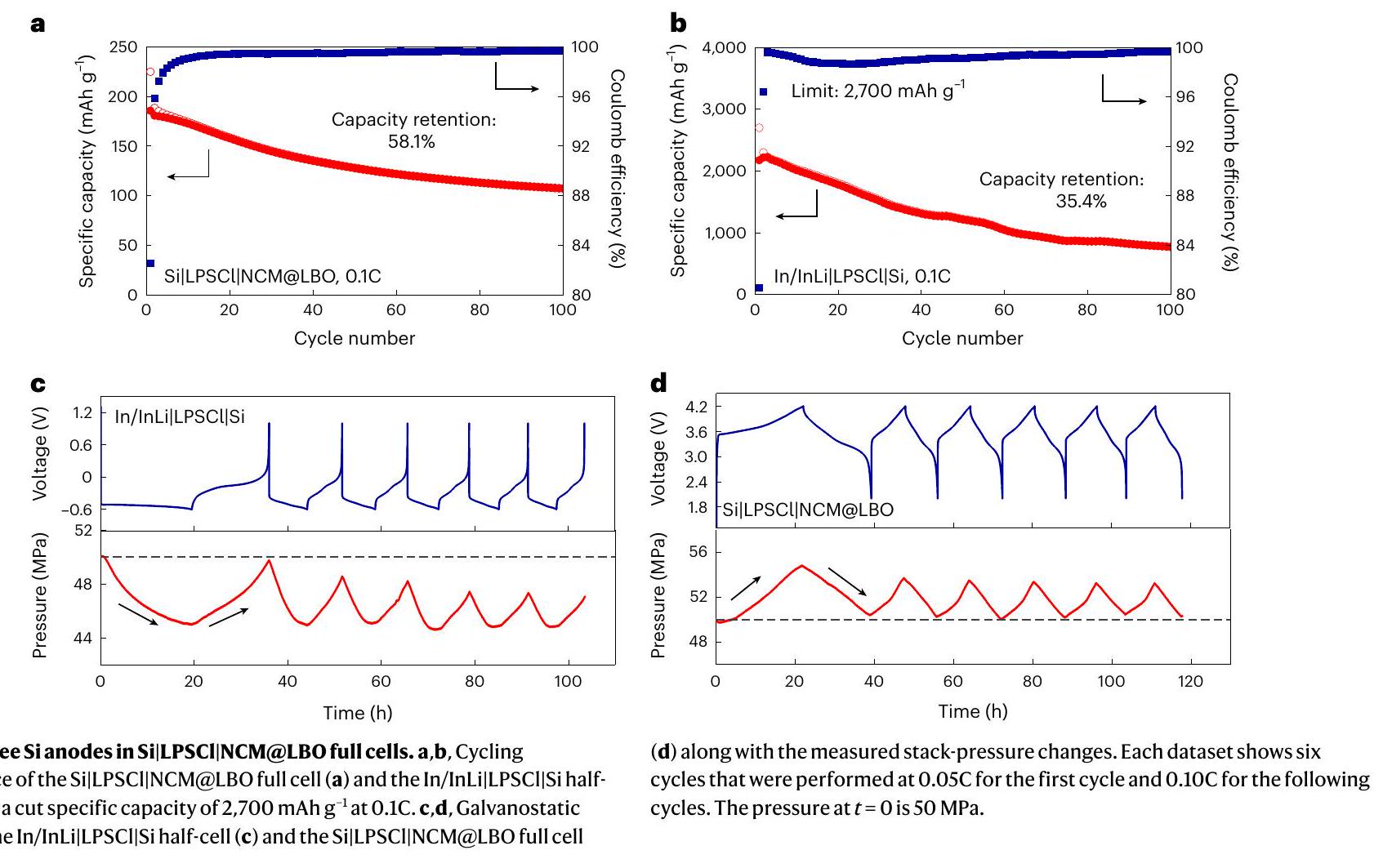 Full SSB cells normally exhibit worse cycling performance compared with half-cells with a Li metal anode due to the fast loss of the lithium balance-driven by irreversible capacities in both anode and cathode. The Si|LPSCI|NCM@LBO full cells show better capacity retention compared with the In/InLi|LPSCI|Si half-cells after 100 cycles at 0.1C (58.1% versus 29.6%). To rationalize this, we first checked whether this comes from incomplete lithiation in full cells due to the N/P ratio of 1.3 (ref. 37). The In/InLi|LPSCI|Si cells were cycled at 0.1 C with a cutoff at a specific capacity of (which is the same degree of lithiation in full cells) for comparison. The capacity retention was after 100 cycles, indicating that the improved cycling stability of full cells does not primarily come from partial lithiation (Fig. 5b). In the next step, the stack-pressure evolution was investigated during galvanostatic cycling. The pristine pressure was 50 MPa . The In/InLi cell shows a negative pressure change (that is, ) during cycling, indicating that the volume change in In/InLi is actually larger than that in the SE-free Si sheet electrode (Fig. 5c). We speculate that the positive pressure change (that is, ) of the Si|LPSCI|NCM@ LBO cell helps to maintain the cycling stability of full cells (Fig. 5d). In addition, the Si/LPSCI composite anode in a Si/LPSCI|LPSCI|NCM@ LBO cell also shows a positive pressure change (Supplementary Fig. 24). We note that half-cells may not be a good choice for the preliminary evaluation of new electrodes under confined pressure conditions, as chemo-mechanics can seriously interfere and lead to different behaviours of full cells.