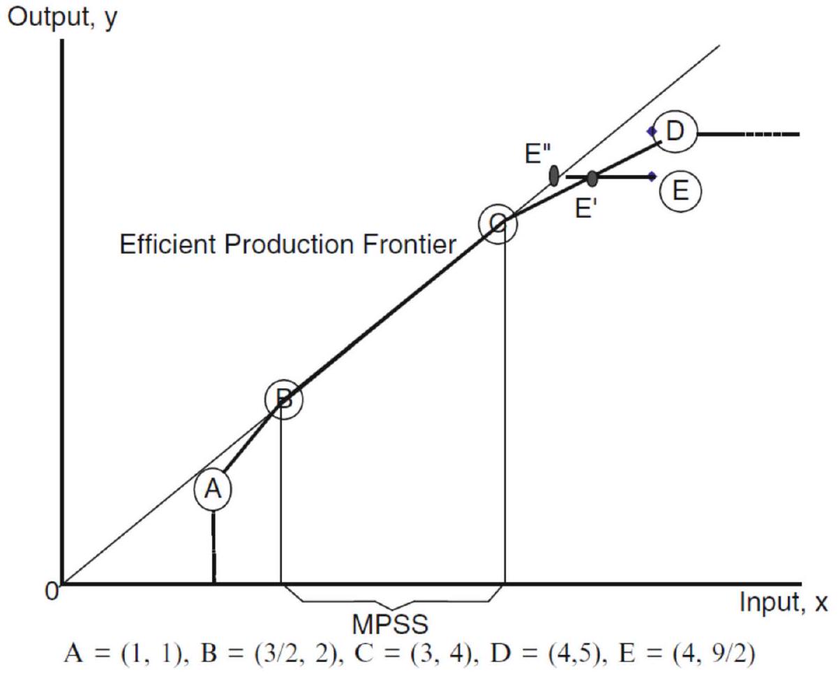 (1) مفهوم RTS محدد جيدًا فقط للنقاط الموجودة على حدود PPS. بالنسبة للنقاط الداخلية، لا يمكن التحقيق في RTS حيث أن التغيرات في الإنتاجية بسبب RTS تتداخل مع التغيرات في الإنتاجية بسبب القضاء على عدم الكفاءة.