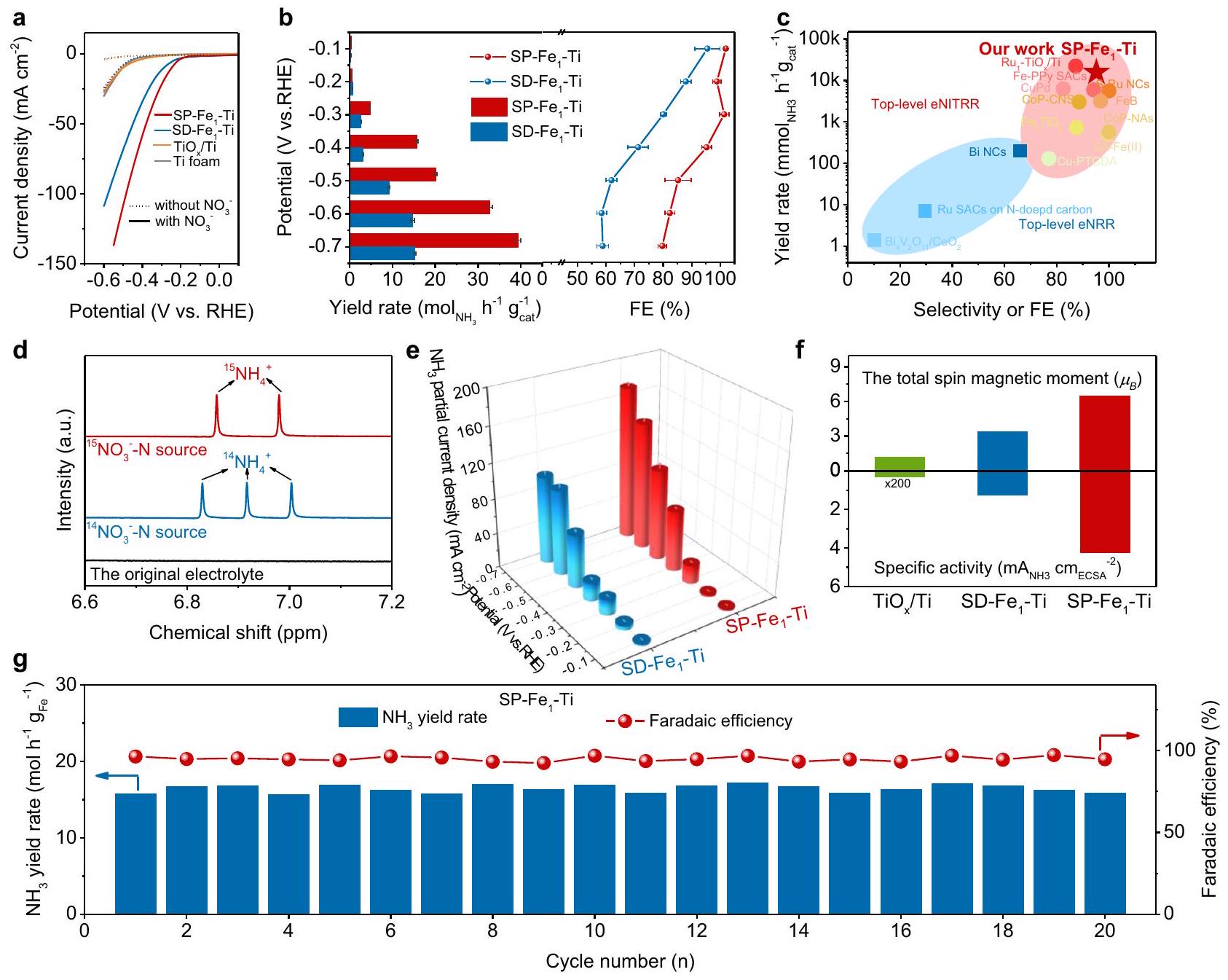 of Ti foam, and electrodes. We further quantified the Faradaic efficiency ( ) and yield rate at a certain potential after 2 h of electrolysis via ultraviolet-visible (UV-Vis) spectrophotometry (Supplementary Figs. 13 and 14). As expected, the SP electrode exhibited higher and yield rate than the electrode (Fig. 3b). Impressively, the SP-Fe1-Ti electrode displayed an attractive yield rate of ) and a high Faradaic efficiency of at -0.4 V vs. RHE, which were also verified by the results obtained from nuclear magnetic resonance (NMR, Supplementary Fig. 15) measurement. Such an excellent NITRR activity of SP- electrode was much superior to those of state-of-the-art NITRR electrocatalysts, Haber-Bosch catalysts and reduction electrocatalysts (Fig. 3c and Supplementary Table 3). Additionally, electrode possesses promising application potential for maximizing , onset potential and current density at certain potential (Supplementary Table 4) over almost all of top-level NITRR electrodes consisting of the low-price components (e.g., , and Fe in Supplementary Table 5). We also drop -casted SP-Fe1-Ti catalyst powders on the carbon fiber paper with the catalyst mass loading of for performance assessment. As shown in Supplementary Fig. 16, catalyst displays a high cathodic current density of at -0.4 V vs. RHE, superior to most of the top-level NITRR catalysts. The yield rate defined by the electrode area of SP- catalyst was determined to be , which outperforms most of low-price metal -based catalysts and even several high-price metal-based catalysts (Supplementary Table 6). More importantly, the monolithic nature of electrode is much more feasible than the powder form of previous top-level NITRR electrocatalysts for practical application.