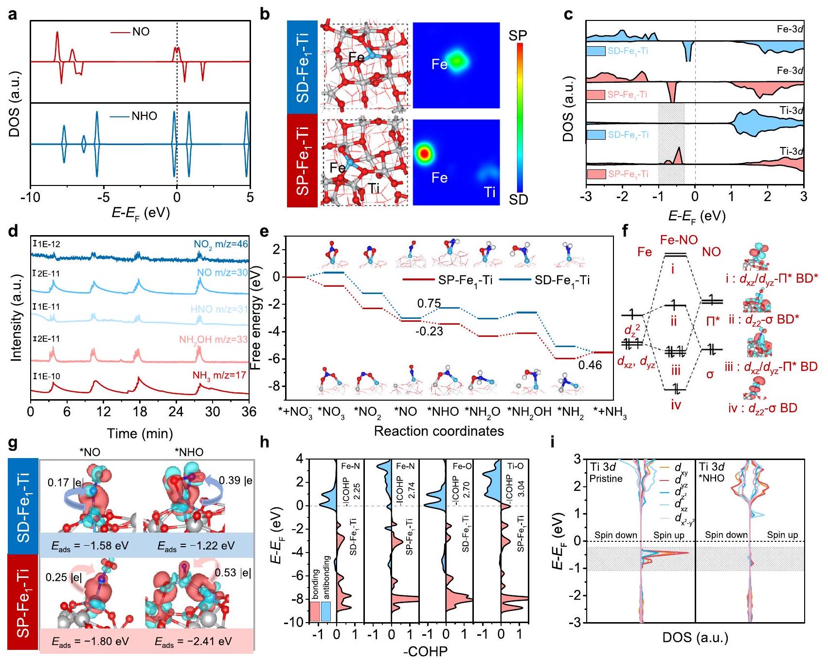 b Optimized structures and calculated 2D spin density diagrams of SD- and . c DOSs of Fe and Ti atoms on and . d DEMS measurements of NITRR over SP- electrode. e Calculated free energy diagrams for NITRR on SD- and SP- . f Major orbital interactions between Fe atom and NO molecule as well as the corresponding molecular orbital diagrams (BD