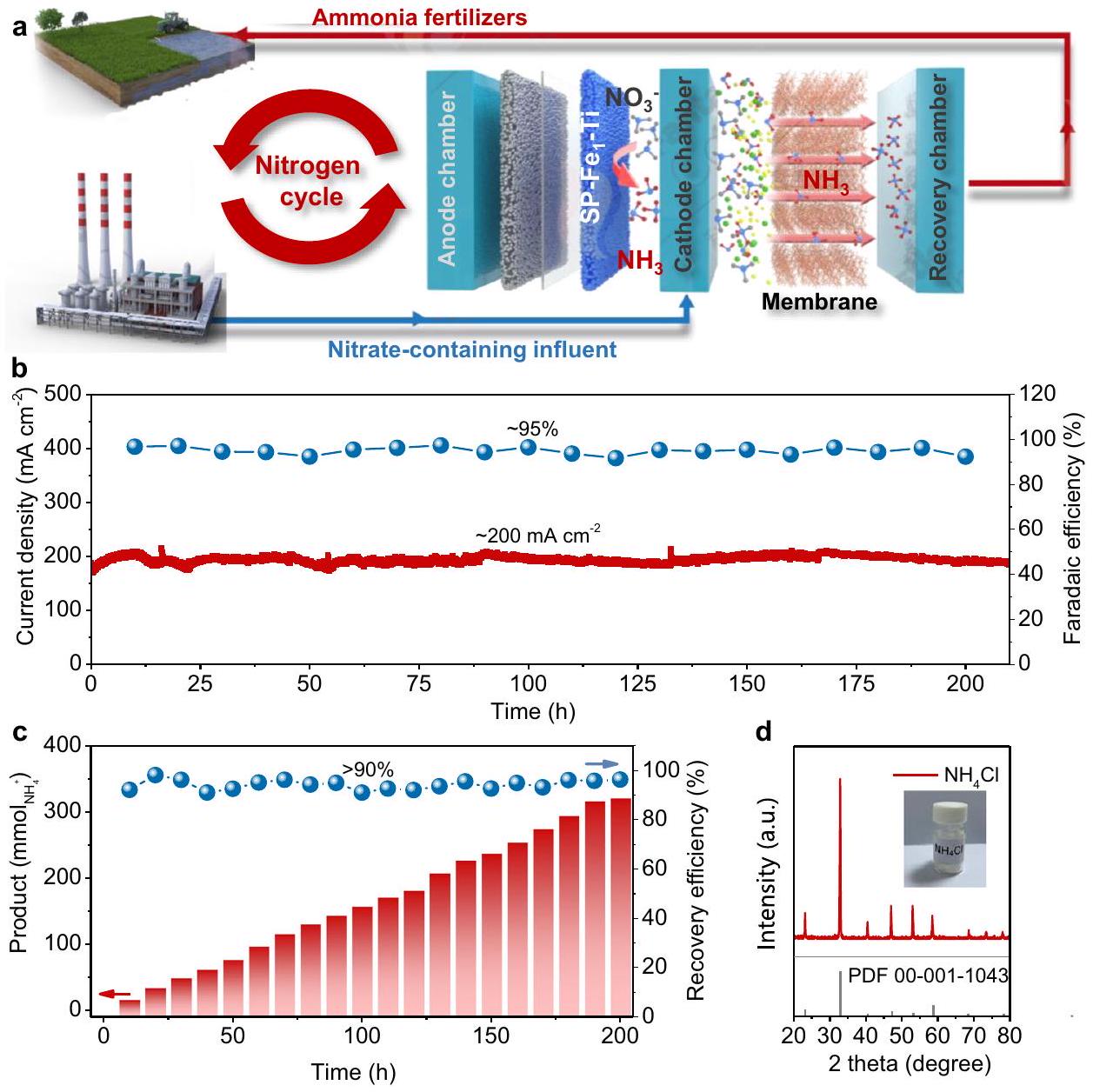back to the cathode chamber. During this process, the produced could permeate through membrane between the cathode chamber and the recovery chamber and be absorbed by acid solution in the recovery chamber . By using the monolithic cathode, the coupled device could robustly work at an industrial-level current density of for up to 200 h with a high of (Fig. 5b). As a result, this sustainable and decentralized system achieved high NITRR and simultaneous recovery with nearly selectivity and about recovery efficiency (Fig. 5c). After long-term electrolysis, the measured contact angle of membrane (Supplementary Fig. 39) was determined to be , similar with that of pristine membrane ( ), suggesting that the post-reacted membrane still kept its hydrophobicity. After further rotary evaporation, the recycled ammonia in solution could be converted into high-purity powder , as confirmed by the XRD pattern (Fig. 5d). These findings demonstrated the feasibility of selective conversion of nitrate-containing wastewater into upgraded ammonia fertilizers through combining the high-performance SP- – Ti monolithic cathode with the integrated device, providing a sustainable way for nitrogen cycle.