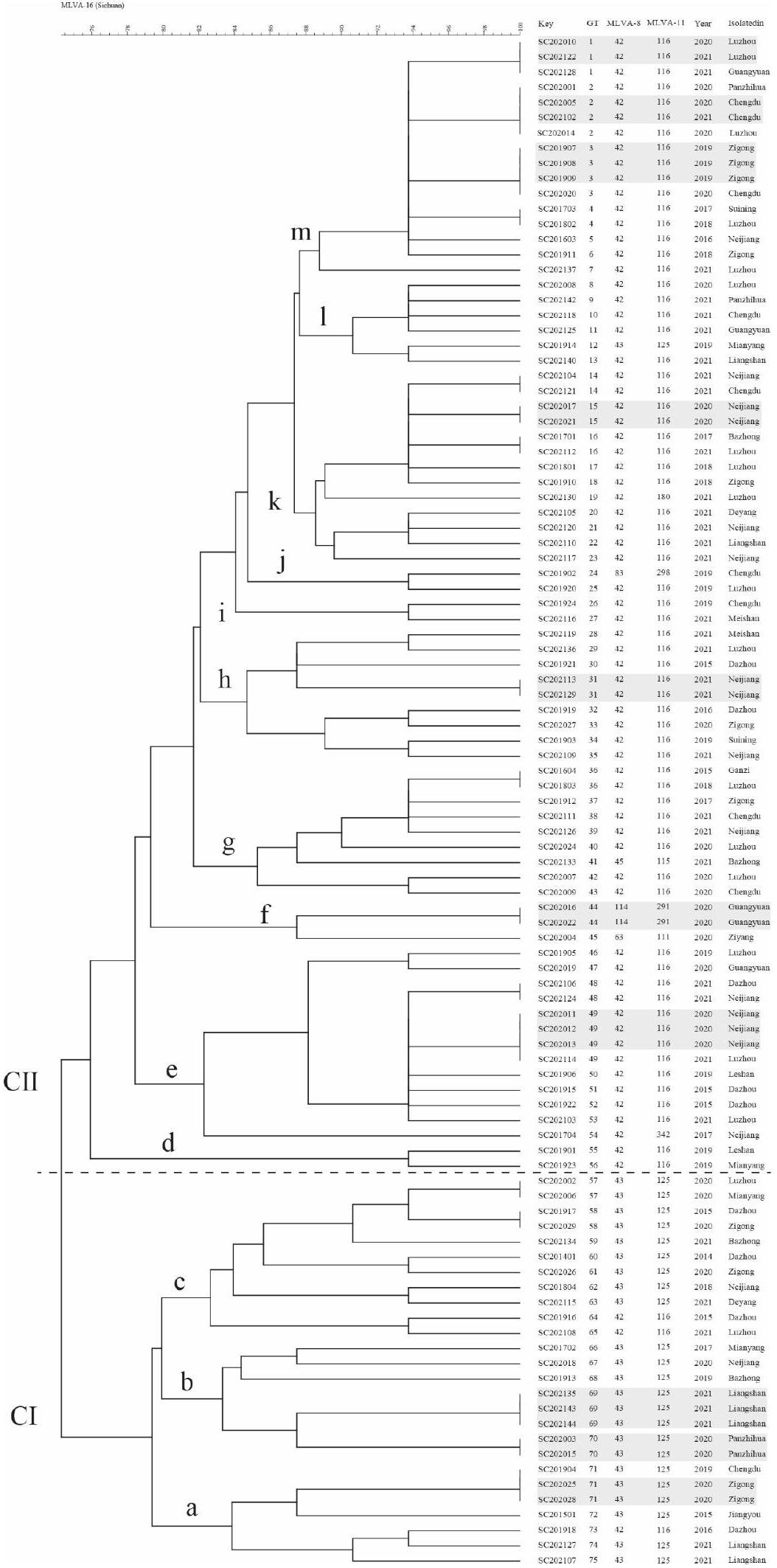 حمى البروسيلات البشرية هي مرض متجدد في مقاطعة سيتشوان، الصين. في هذه الدراسة، تم تطبيق علم الجراثيم، والتصنيف الحيوي التقليدي، وتحليل تسلسل المواقع المتعددة (MLST)، وتحليل تكرار المواقع المتعددة المتغيرة العدد (MLVA) لتوصيف السلالات بشكل أولي من حيث التنوع الجيني والروابط الوبائية. تم عزل ما مجموعه 101 سلالة من بروسيلة من 16 مدينة (دوائر ذاتية الحكم) من عام 2014 إلى 2021، وتم تحديد جميع السلالات على أنها بروسيلة ميلتينسيس bv. 3، مما يشير إلى أن المراقبة يجب أن تركز على المجترات. حدد تحليل MLST أربعة أنماط (STs)، وهي ST8 (