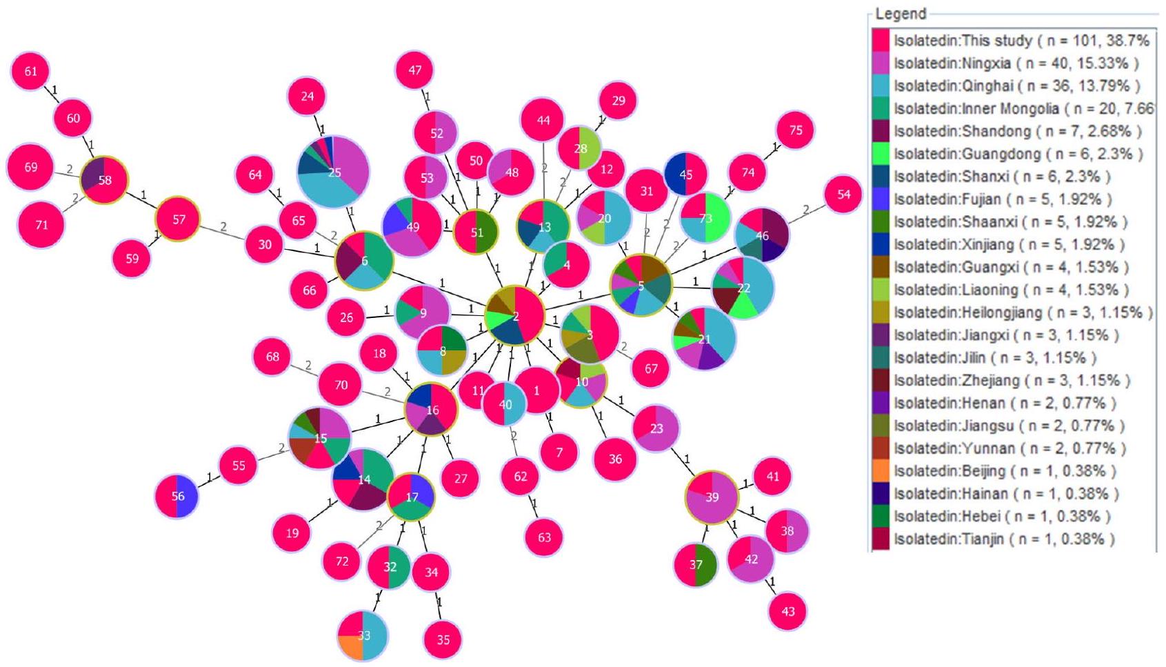 توزعت السلالات التي تنتمي إلى ST8 في شمال وشمال شرق الصين، بما في ذلك منغوليا الداخلية، شينجيانغ، قانسو، تشينغهاي، شنشي، ومقاطعة هيلونغجيانغ [19]. تظهر التقارير الأخيرة أن ب. ميلتينسيس ST39 تم عزلها لأول مرة في مدينة زون يي، مقاطعة قويتشو في عام 2013، وقد تم عزل العديد من السلالات التي تنتمي إلى مجموعة ST في هذه المقاطعة [20]. تشير السلالات المعزولة من ب. ميلتينسيس ST8 و ST39 في سيتشوان إلى أن مصدر العدوى كان من خارج المقاطعة؛ ومع ذلك، تحتاج التفاصيل المتعلقة بالروابط الوبائية بين هذه السلالات إلى مزيد من التمييز بواسطة WGS-SNP [21]. علاوة على ذلك، تم اكتشاف نوعين جديدين من ST في هذه الدراسة، وكل منهما يمثل سلالة واحدة فقط. أظهر مقارنة التسلسل بين ST8 و ST101 أنهما يختلفان في
