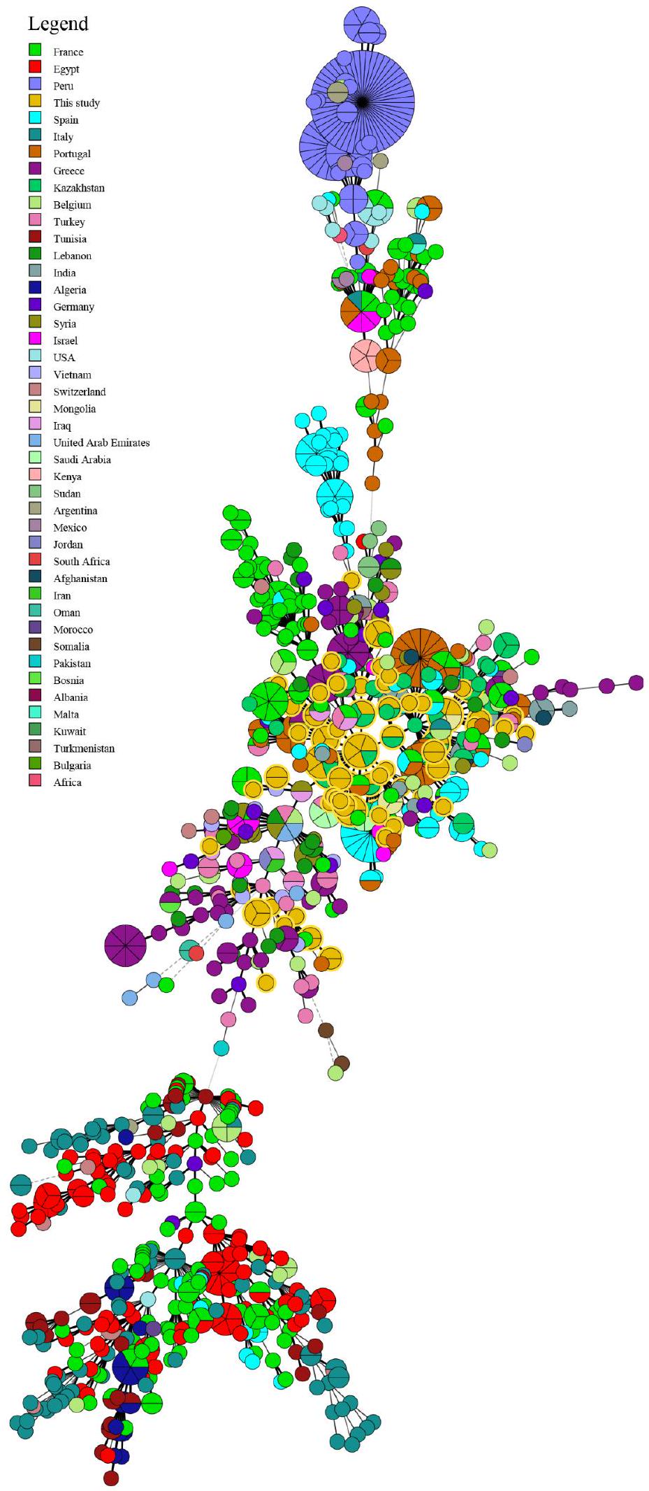 | STs | أروأ | cobQ | دي إن إيه كيه | فجوة | جل ك | جير ب | int_hyp | omp25 | trpE | عدد السلالات | توزيع المدن |