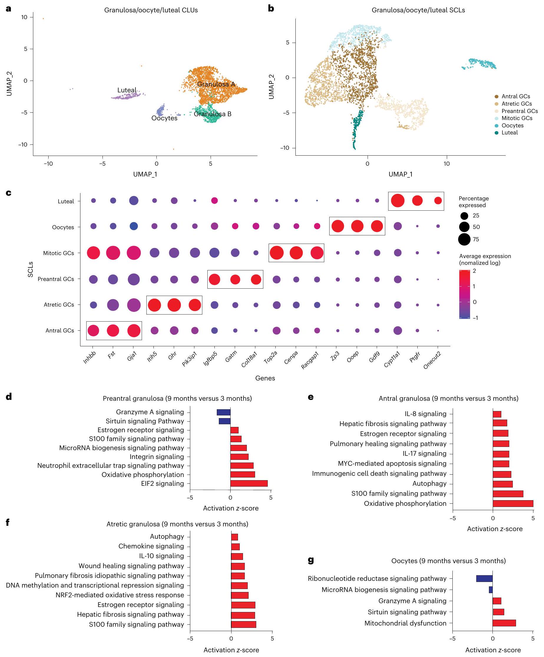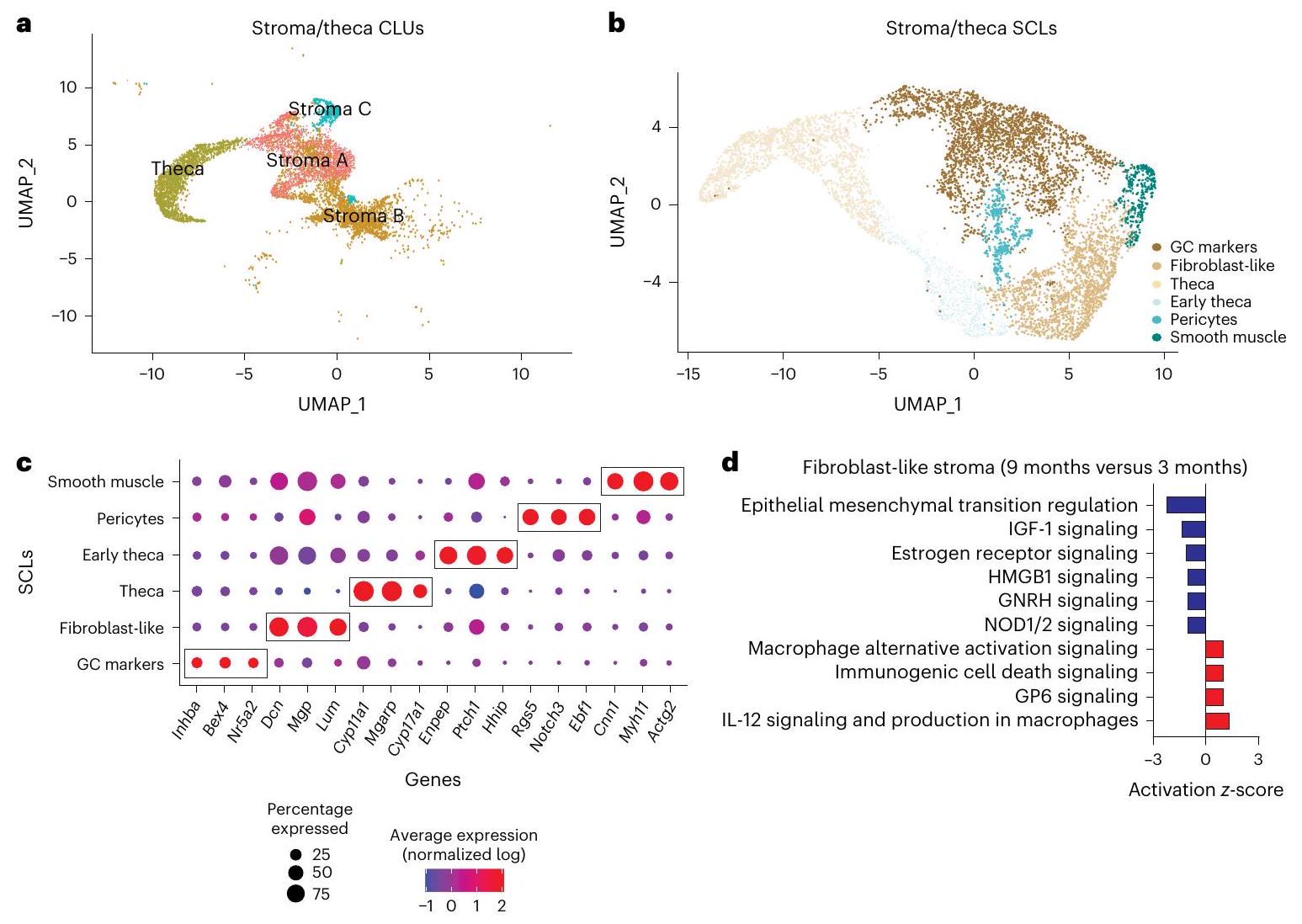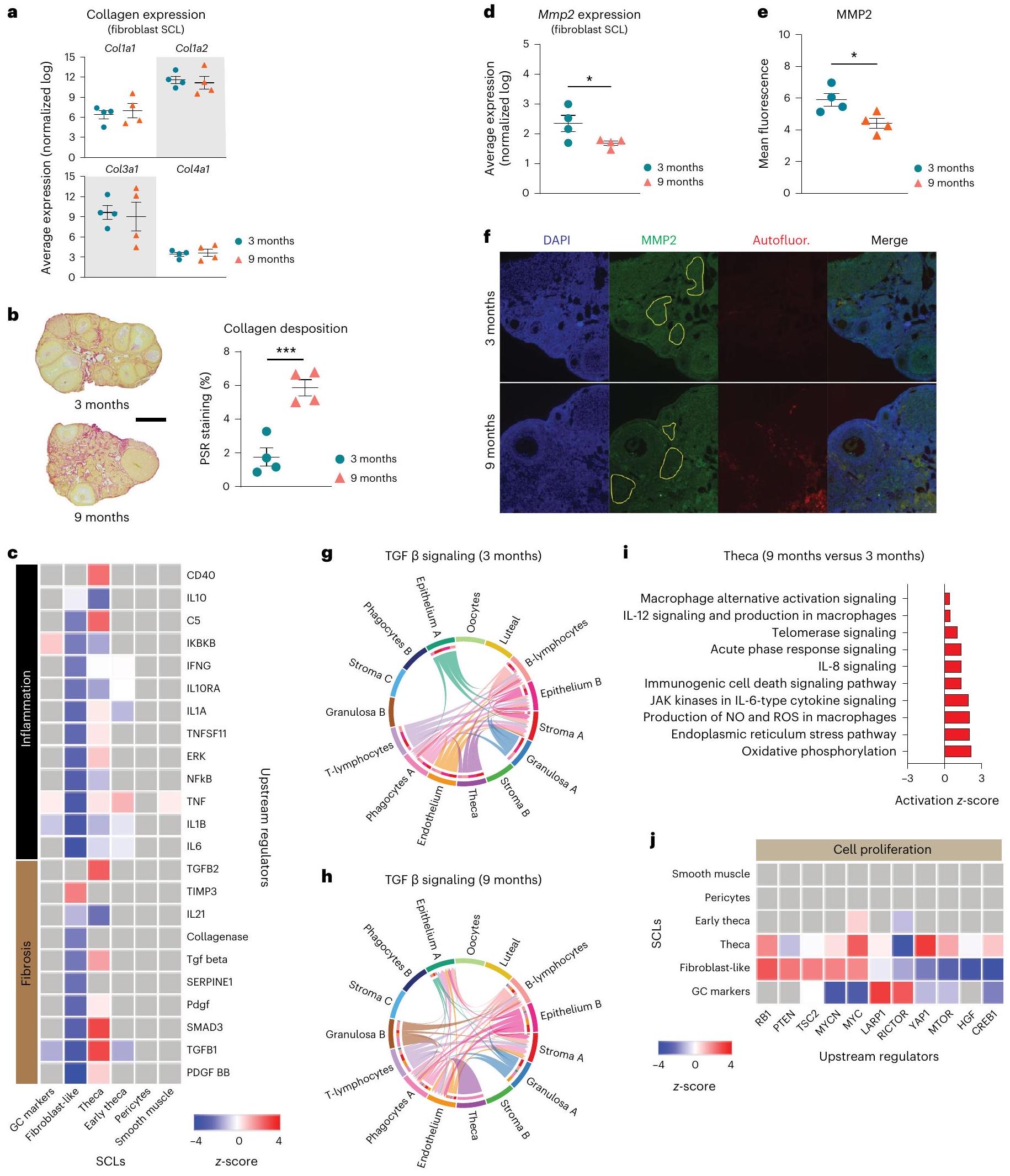 signaling pathway interactions in 3-month (g) and 9-month ovarian CLUs (h). i, IPA canonical pathways indicating activation of specific pathways by aging in TCs. j, IPA upstream regulator analyses of age-related changes in stroma and TC SCLs ( 9 versus 3 months old, -score) related to cell proliferation ( per age group). scRNA-seq was performed in ovaries per age group. Data presented as mean s.e.m. by one-tailed -test or two-tailed -test (d,e). ROS, reactive oxygen species. Exact values shown in Source Data.