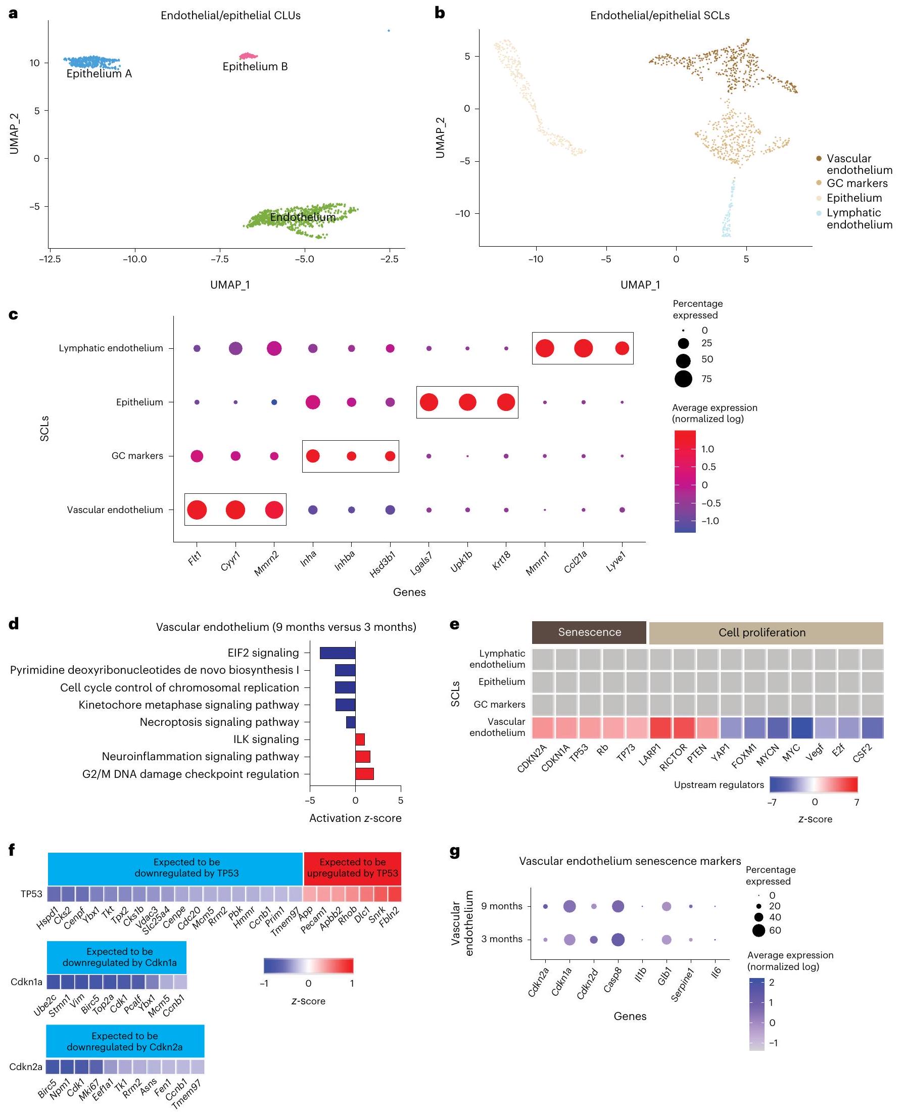 تفاعلات مسارات الإشارة في وحدات الجسم الأصفر المبيضي (CLUs) في 3 أشهر (g) و9 أشهر (h). i، مسارات IPA الكلاسيكية التي تشير إلى تنشيط مسارات محددة بسبب الشيخوخة في خلايا TC. j، تحليلات المنظمين العلويين في IPA للتغيرات المرتبطة بالعمر في السدى وSCLs في خلايا TC (9 مقابل 3 أشهر). -النتيجة) المتعلقة بتكاثر الخلايا ( حسب الفئة العمرية). تم إجراء تسلسل RNA أحادي الخلية في المبايض حسب الفئة العمرية. البيانات مقدمة كمتوسط س.م. بجانب واحد -اختبار أو ذو ذيلين -اختبار (د، هـ). ROS، أنواع الأكسجين التفاعلية. دقيق القيم المعروضة في بيانات المصدر.