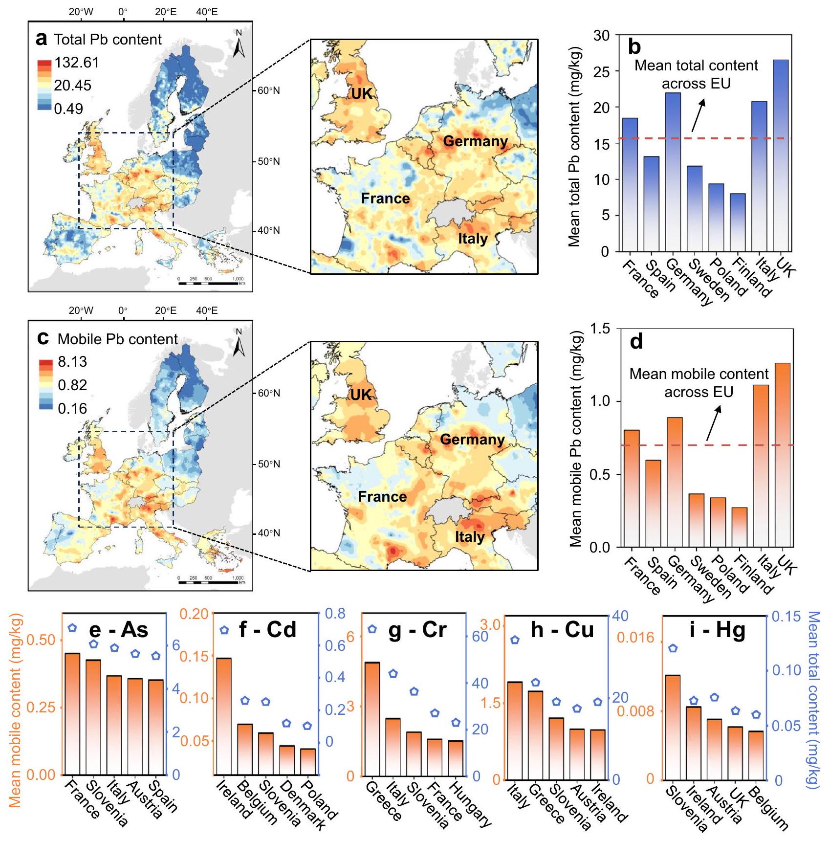 exhibited the highest mobile Pb content; however, Italy exceeded Germany in terms of mobile Pb (Fig. 4b, d).