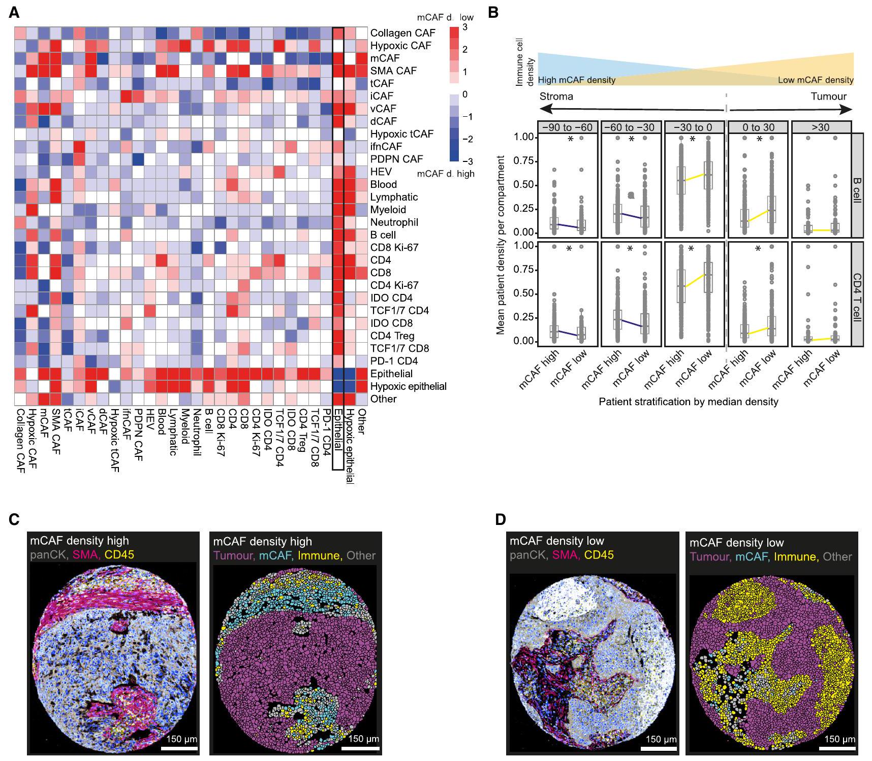 الملخص على الرغم من التقدم في العلاج، تظل معدلات البقاء على قيد الحياة في سرطان الرئة منخفضة. سيساعد فهم أفضل للتنوع الخلوي والتفاعل بين الخلايا الليفية المرتبطة بالسرطان (CAFs) داخل بيئة الورم الدقيقة في تطوير العلاجات الشخصية. نحن نقدم تحليل تصوير الخلايا الفردية بدقة مكانية (IMC) للخلايا الليفية المرتبطة بالسرطان في مجموعة سرطان الرئة غير صغير الخلايا تضم 1,070 مريضًا. نحدد أربع مجموعات مرضى تنبؤية بناءً على 11 نمطًا من الخلايا الليفية المرتبطة بالسرطان مع توزيعات مكانية مميزة ونظهر أن الخلايا الليفية المرتبطة بالسرطان هي عوامل تنبؤية مستقلة لبقاء المرضى. وجود خلايا ليفية شبيهة بالورم مرتبط ارتباطًا وثيقًا بتشخيص سيء. بالمقابل، ترتبط الخلايا الليفية الالتهابية وخلايا CAFs المستجيبة للإنترفيرون ببيئات ورمية ملتهبة وزيادة بقاء المرضى. الكثافة العالية من خلايا CAFs المصفوفة مرتبطة بانخفاض في التسلل المناعي وترتبط سلبًا ببقاء المرضى. باختصار، تحدد بياناتنا الميزات النمطية والمكانية لخلايا CAFs المرتبطة بنتائج المرضى في NSCLC.