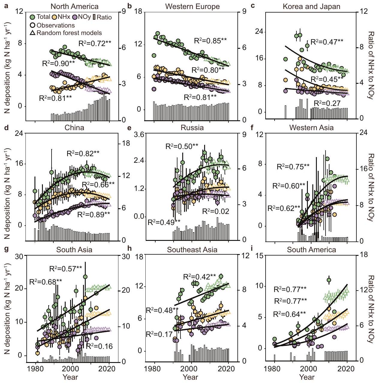 الأرضية العالميةازداد ثم استقر وانخفض قليلاً خلال الفترة من 1980 إلى 2020، ليصل إلى ذروته في عام 2015 عند (الشكل 1ب). من 1980 إلى 1982، كان أقل قليلاً من، ولكن الزيادة اللاحقة فيكان أسرع بكثير من و انخفضت قليلاً بعد عام 2015 (الشكل 1ب). على مدى الأربعين عامًا الماضية، كانت نسبةإلىقد زاد تدريجياً من 0.81 في عام 1980 إلى أقصى حد بلغ 1.73 في عام 2007. ثم بدأ في الانخفاض واستقر عند 1.5 بعد عام 2010 (الشكل 1c). المدخل التراكمي لـإلى الأراضي العالمية من 1980 إلى 2020 كان حوالي 3117 طن نيتروجين (الشكل 1d) في حين كان استخدام الأسمدة النيتروجينية العالمية حوالي. وبالتالي، كانت مدخلات النيتروجين إلى النظم البيئية الأرضية من خلال الترسيب الجوي تقريبًا تعادل مدخلات النيتروجين من الأسمدة خلال تلك الفترة.