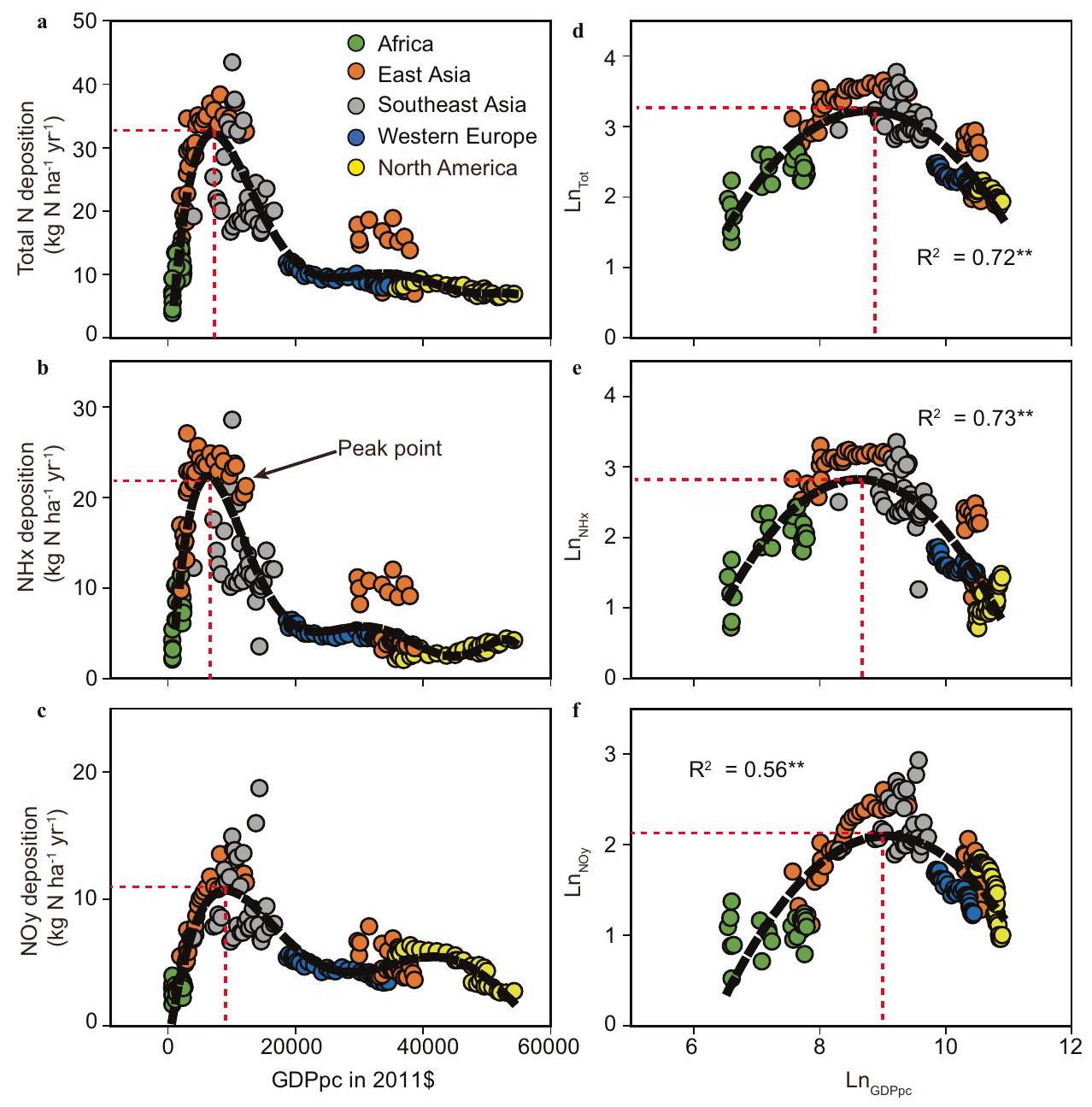 قمنا بدمج البيانات العالمية لخمس مناطق – شرق آسيا، جنوب شرق آسيا، أفريقيا، غرب أوروبا وأمريكا الشمالية – التي كانت لديها ملاحظات عن ترسيب النيتروجين على مدى فترة طويلة نسبياً في مراحل مختلفة من التنمية الاجتماعية في مجموعة بيانات إقليمية واحدة. تم استخدام طريقتين لتحليل العلاقة بين والناتج المحلي الإجمالي للفرد، ولتحديد ما إذا كان يتوافق مع منحنى كوزنتس البيئي. أولاً، استنادًا إلى الرسوم البيانية المبعثرة، تم استخدام معادلة من رتبة عالية لاستكشاف العلاقة بين الناتج المحلي الإجمالي للفرد وفي كل منطقة. ثانياً، معادلة مكعبة لوغاريتمية (المعادلة (2))تم استخدامه لتحليل العلاقة بين ومعلمات ملاءمة المعادلة التكعيبية اللوغاريتمية مدرجة في الجدول التكميلي 5.