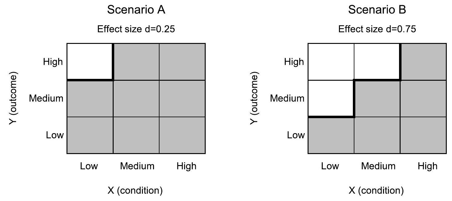 دراسات الرضا، قد يكون هذا هو درجة رضا الموظفين عن العمل بمعدل 70 (على مقياس من 0 إلى 100) (كما في هاف وآخرون، 2015)، بينما في مشروع تسويقي حول رضا العملاء قد يكون هذا مستوى مرجعي يبلغ 75 أو أكثر، اعتمادًا على الصناعة (على مقياس من 0 إلى 100) (مؤشر رضا العملاء الأمريكي، 2022؛ ريجدون وآخرون، 2010). اعتمادًا على هذه المستويات، قد يحتاج الباحثون إلى تغيير عرض الخطوات في جداول الاختناق الخاصة بهم لإظهار مستوى الأداء المحدد للبناء المستهدف (على سبيل المثال، زيادة عدد الخطوات من 10 إلى 20 ستوفر معلومات حول