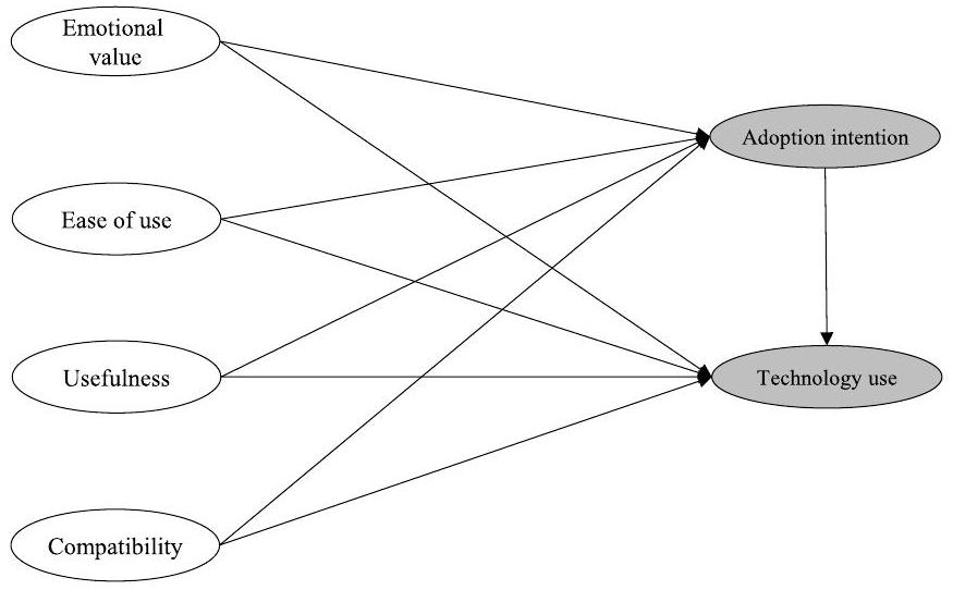 Technology use | Adoption intention | Emotional value | Ease of use | Perceived usefulness | Compatibility |
