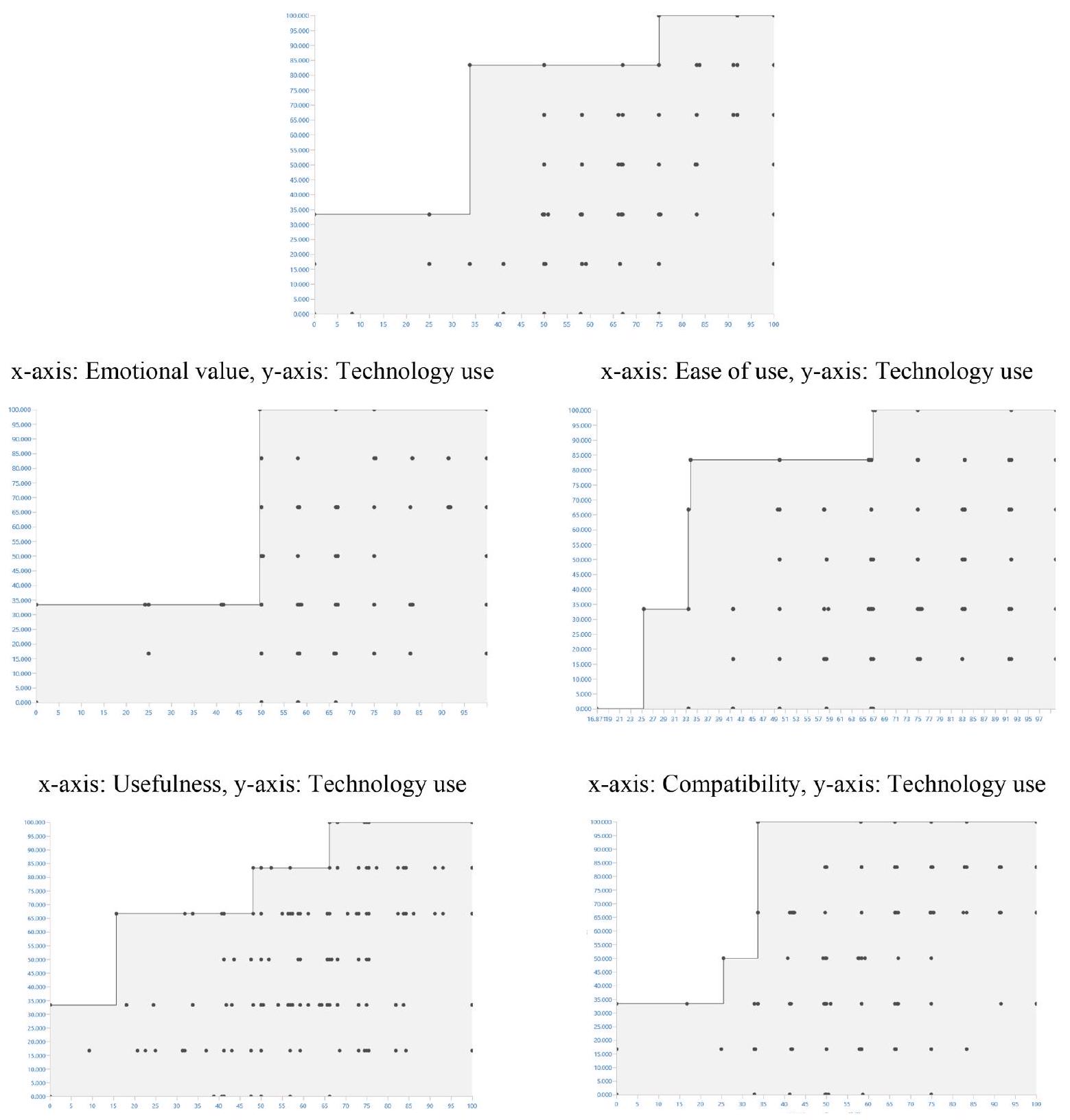 Bottleneck table technology use: actual values for technology use (based on the rescaled PLS-SEM latent variable scores from 0 to 100) and the percentiles of antecedent constructs.