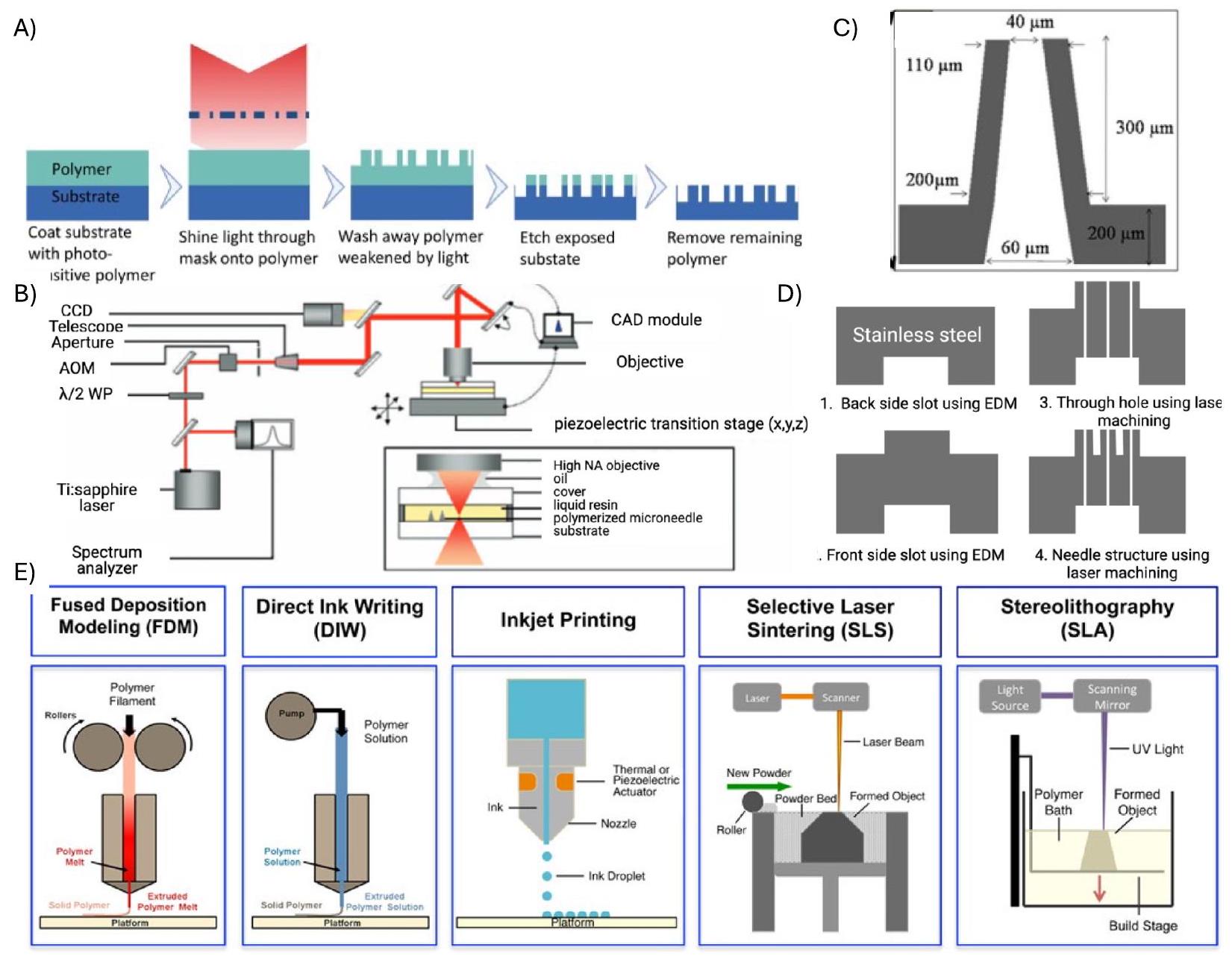 2.1.1.1. الفوتوليثوغرافي. الطريقة الأكثر شيوعًا لتصنيع الإبر المجهرية القابلة للاستخدام هي الفوتوليثوغرافي بالتزامن مع إما الحفر الأيوني التفاعلي العميق (DRIE) أو الحفر الرطب. الفوتوليثوغرافي هو تقنية تستخدم لنقل نمط من قناع إلى شريحة في ثلاث خطوات. يتم تغليف شرائح السيليكون بطبقة رقيقة من مادة مقاومة للضوء إما عن طريق الطلاء الدوراني أو الرش. ثم يتم تعريض هذه الشرائح المطلية لأشعة UV من خلال قناع فوتوغرافي وأخيرًا يتم تطويرها لإزالة المقاومة المتبقية، مما يكشف عن ميزات القناع [44]. يتم الحصول على الهياكل النهائية باستخدام إما طرق الحفر الرطب أو الجاف (الشكل 2A). يستخدم الحفر الرطب محلول قلوي أو حمضي يعرف باسم المحلول الحفري لحفر المناطق غير المحمية من الشريحة. هذه الطريقة لحفر السيليكون مفيدة بسبب بساطتها وسهولة تنفيذها ومعدل الحفر العالي، مما يمنع بدوره تدمير الطبقة الواقية [52]. على الرغم من هذه المزايا، هناك العديد من العيوب الكبيرة، مثل التكاليف العالية وعدم القدرة على الحفاظ على نفس معدل الحفر الأولي طوال العملية [45]. بسبب انتشار العيوب، يتم استخدام حفر DRIE بشكل أكثر تكرارًا من عمليات الحفر الرطب. DRIE، المعروف أيضًا بعملية بوش، هو تقنية شديدة التوجه لإنشاء هياكل السيليكون [53]. تستخدم عملية بوش ثلاث خطوات: إيداع طبقة بوليمر، إزالة الطبقة المودعة ثم السيليكون