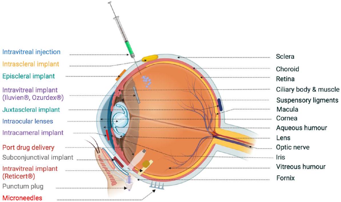 administration of such drugs may lead to systemic side effects. Another widely prescribed medication for treating posterior ocular diseases is intravitreal injections. Although they are highly invasive and risk bearing, these intravitreal injections of potential therapeutics are prescribed due to potential advantages [8]. Currently, intravitreal injections of monoclonal antibodies, namely, bevacizumab and ranibizumab, are being tested for their ability to treat blindness-causing neovascular diseases, including retinopathy of prematurity [9]. These frequent intravitreal injections are associated with several short-term adverse events, such as endophthalmitis, retinal detachment, intravitreal hemorrhage, and a high risk of cataracts. More recently, periocular injections have been investigated as less invasive methods to achieve therapeutic results in the vitreous cavity. The subventricular, subconjunctival, and peribulbar routes involve periocular injections. These routes of administration are less invasive but are required to overcome the scleral, choroidal or RPE barrier to reach the site of administration [10].
