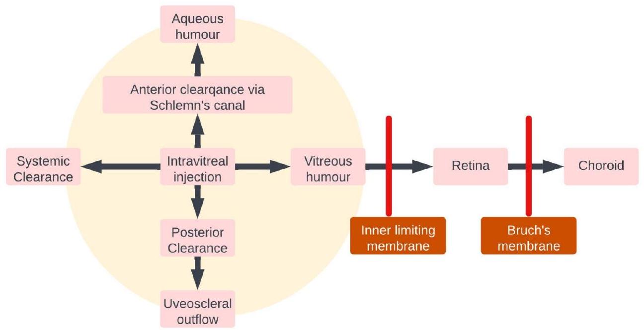 as the ciliary body and lens. Due to the flow of aqueous humor from the front of the eye, distribution into the posterior chamber is very unlikely. Moreover, drugs can permeate into the conjunctiva as opposed to the cornea. This route is typically adopted by large hydrophilic molecules, which then bypass the cornea by moving through the conjunctiva and sclera before moving into tissue structures such as the ciliary body. Given the greater permeability of this tissue in comparison to the cornea [98], this poses a significant challenge for topical delivery and highlights its lack of tissue specificity in comparison to the SCS administration route, for example. Once absorbed into the conjunctiva, the drug is completely cleared from the eye via systemic circulation. This in itself can cause issues, with commonly applied drugs such as beta blockers such as timolol being shown to have off-target effects such as cardiac issues such as bradycardia [98].