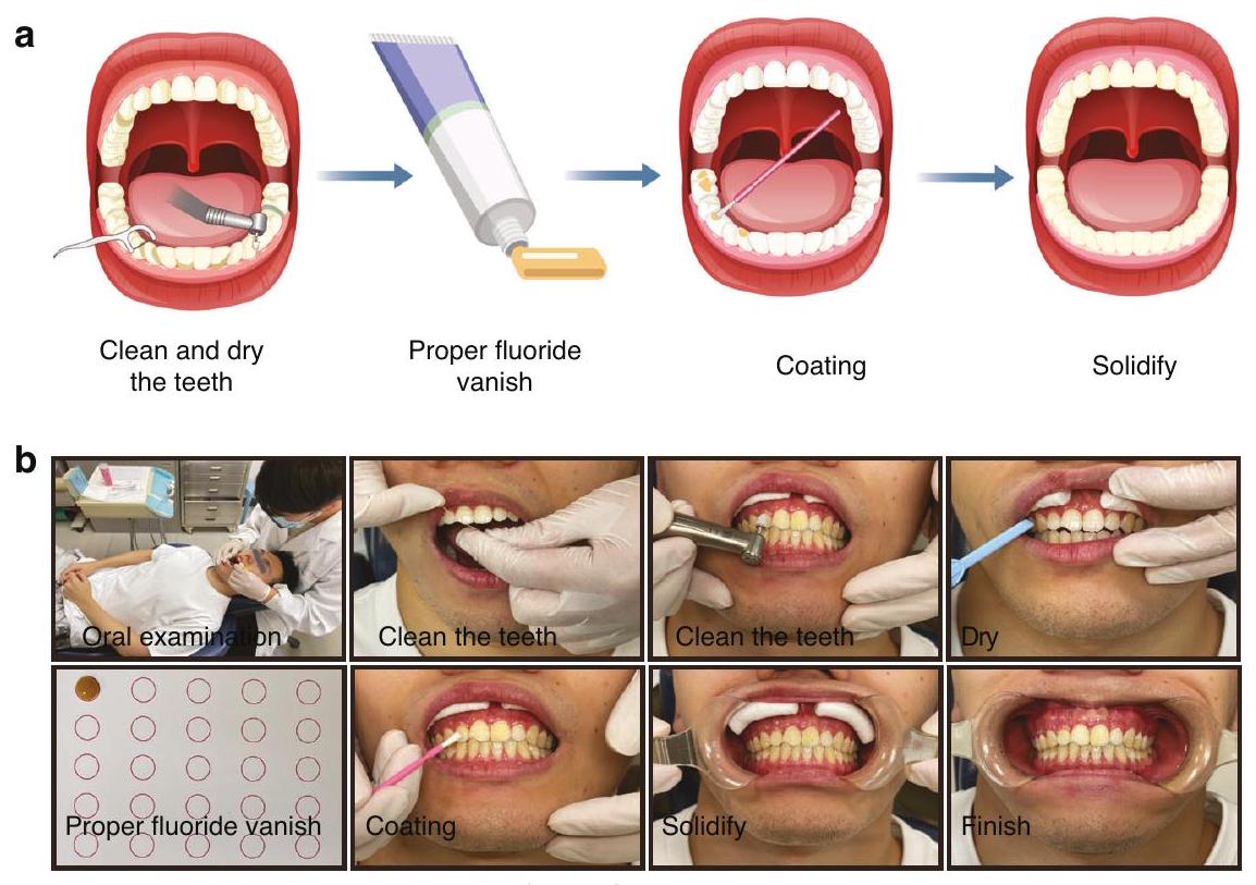 relatively simple. Briefly, the tooth surface is first cleaned and dried. Then, an appropriate amount of fluoride is applied to the tooth surface. It is important to note that no eating should occur within 2 to 4 h after the fluoride application, and brushing should be avoided that evening to ensure the effectiveness of the application.