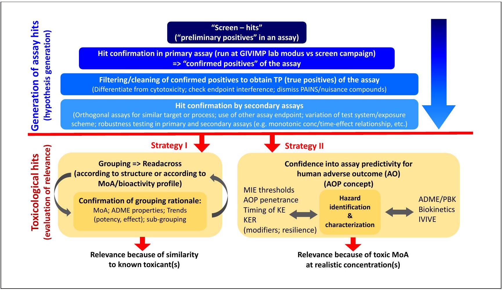 Screens, if run by high-throughput technology, often generate “preliminary positives” that need to be further qualified and characterized. A first step involves repetition of the test, possibly with a more stringent prediction model, more stringent laboratory procedure controls (e.g., according to the OECD Guidance on Good In Vitro Method Practices (GIVIMP)) and with new, well-controlled compound stock solutions. The true positives (TP) are then obtained after elimination of technical artifacts (e.g., fluorescent compounds, or compounds binding unspecifically to proteins), control for cytotoxicity, and cheminformatics filtering for known pan-assay interfering substances (PAINS). Certainty on the bioactivity of such compounds is then obtained classically in secondary and tertiary assays for similar target pathways or structures. These are ideally orthogonal in the sense that they use other test systems and/or readout technologies. In a second phase, such “convincing” assay hits are evaluated for their toxicological relevance. Strategy I tests the relevance by establishing the similarity of the assay hit to known, well-characterized toxicants. The definition of similarity relies on (i) structural similarity, (ii) similar ADME properties, and (iii) a similar bioactivity profile/mode-of-action (MoA). Strategy II tests the relevance based on the expected MoA or the activation of a reliable adverse outcome pathway (AOP). Essential issues are (i) whether the concentrations triggering an AOP molecular initiation event (MIE) or key event (KE) are realistically reached, whether it is likely that the triggered AOP also continues to the adverse outcome (AO). A more comprehensive investigation would use quantitative in vitro-to-in vivo (IVIVE) extrapolation models and would consider whether key event relationships (KER) affected by modifiers or counter-regulations.