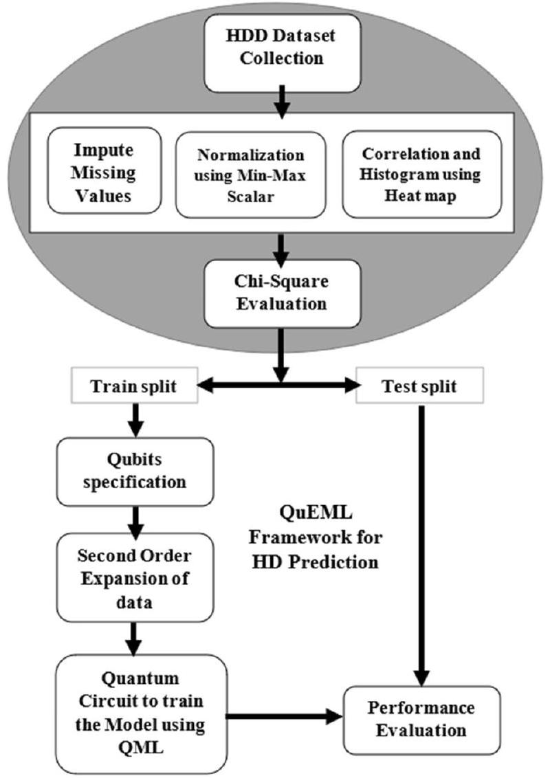 الخطوات التي تم اتباعها في هذا البحث موضحة في الشكل 1. يتم إخضاع البيانات المجمعة (HDD) لتحليل البيانات الاستكشافية (EDA) لإزالة القيم الشاذة، وتقدير القيم المفقودة، وتطبيع مجموعة البيانات. ثم يتم إدخال مجموعة البيانات المعالجة إلى تقييم كاي-تربيع للاحتفاظ بأعلى الميزات تصنيفًا (TRF). بعد ذلك، يتم تقسيم مجموعات البيانات مع TRF إلى مجموعة تدريب واختبار بنسبة 70:30. الآن، يتم تطوير النهج المعزز بالكم بناءً على بيانات التدريب حيث يتم تحديد عدد الكيوبتات بناءً على (عدد الميزات). يمكن إجراء مزيد من رسم الميزات عن طريق تشابك الكيوبتات لتوسيع من الدرجة الثانية. أخيرًا، يتم إنشاء الدائرة الكمومية لتدريب النموذج باستخدام أساليب التعلم الآلي الكمومي مثل QSVM و QANN و QBE. بعد ذلك، يتم تقييم أداء إطار التعلم الآلي المعزز بالكم ضد أساليب التعلم الآلي التقليدية من خلال مجموعة الاختبار استنادًا إلى عدة مقاييس أداء مثل الدقة، والتميز، والاسترجاع، ودرجة F1. يتم تصوير العملية العامة لإطار QuEML المقترح في الخوارزمية 1.