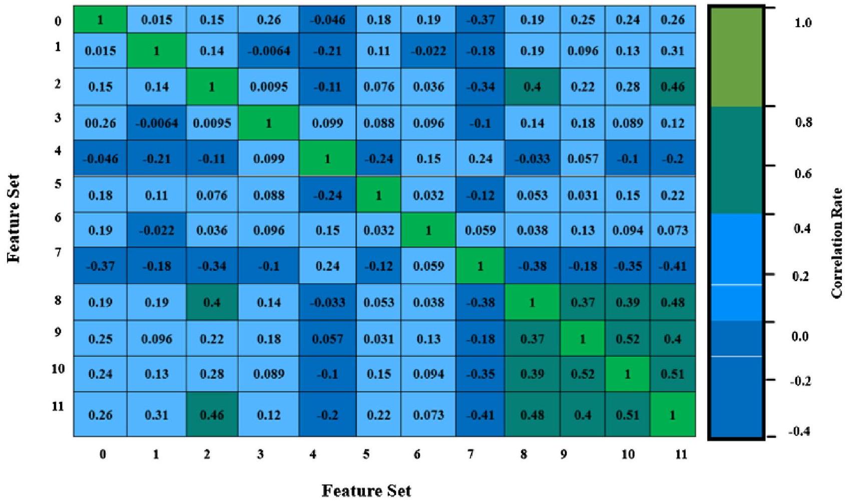 يعتبر خطوة أساسية في التحليل القائم على البيانات. يتعامل مع تصور البيانات من جوانب مختلفة مثل إدخال القيم المفقودة، والتطبيع، وتحديد السمات ذات الارتباط العالي والانحراف المنخفض. يمكن القيام بذلك بمساعدة مكتبات pandas وmatplotlib، والنتيجة موضحة في الشكل 2، من الذي تم استنتاج أن مجموعة البيانات المختارة لا تحتوي على قيم مكررة أو فارغة، وأنها جيدة وسيتم تحليلها بشكل أكبر. بعد ذلك، يتم تطبيق تقنية مقياس Min-Max على مجموعة البيانات المعطاة، والتي تعيد قياس البيانات من نطاقها الأصلي إلى نطاق محدد.باستخدام المعادلة (1) حيث X ‘ هو قيمة معادلة و X هو قيمة أصلية، والرموز المختلفة المستخدمة في الأقسام التالية موضحة في الجدول 4. يمكن القيام بذلك بمساعدة MinMaxScaler () من مكتبة sklearn، والتي تمكّن أيضًا خوارزميات التعلم الآلي المعززة كميًا من معالجة مجموعة البيانات بشكل متساوٍ. أخيرًا، يمكن استنتاج الميزات المهمة من مجموعة البيانات المعطاة بواسطة heatmap () التي تحدد العلاقة بين كل ميزة كما هو موضح في الشكل 3.