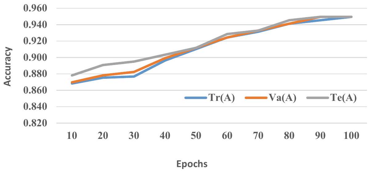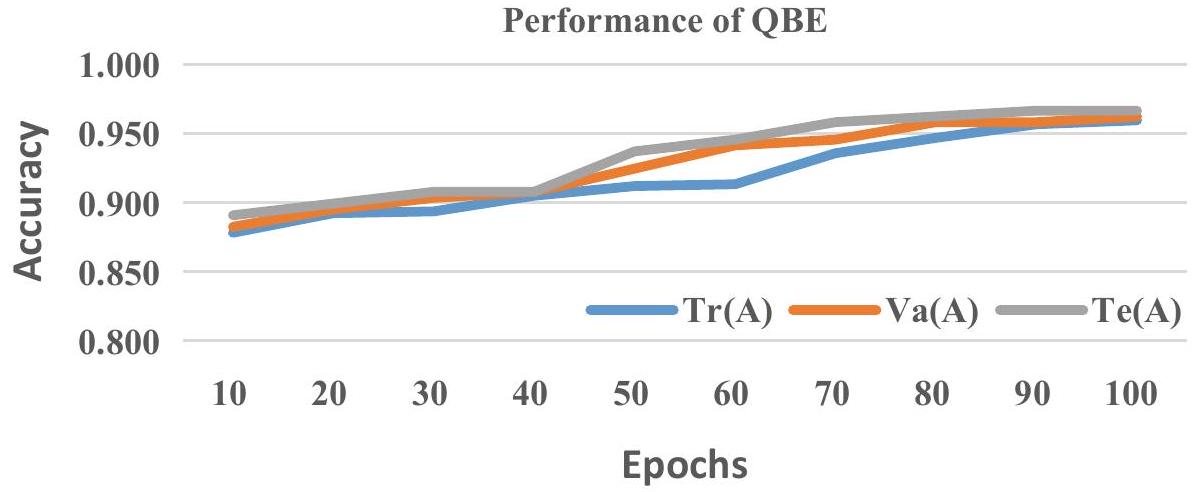 To measure the generalization performance of the proposed quantum framework, the given data set is split and training , testing and validation accuracy is measured at each epoch from 1 to 100 which is shown in Figs. 7, 8 and 9 At the 100th epoch, QBE has , and rates of , and 0.966 respectively. Likewise, QSVM and QANN have increased the accuracy rate from 0.872 and 0.815 to 0.950 and 0.929 respectively. From the above charts, it is visible that the proposed quantum framework is free from overfitting which shows its excellence in generalization performance since it greatly reduces the distance between , and .