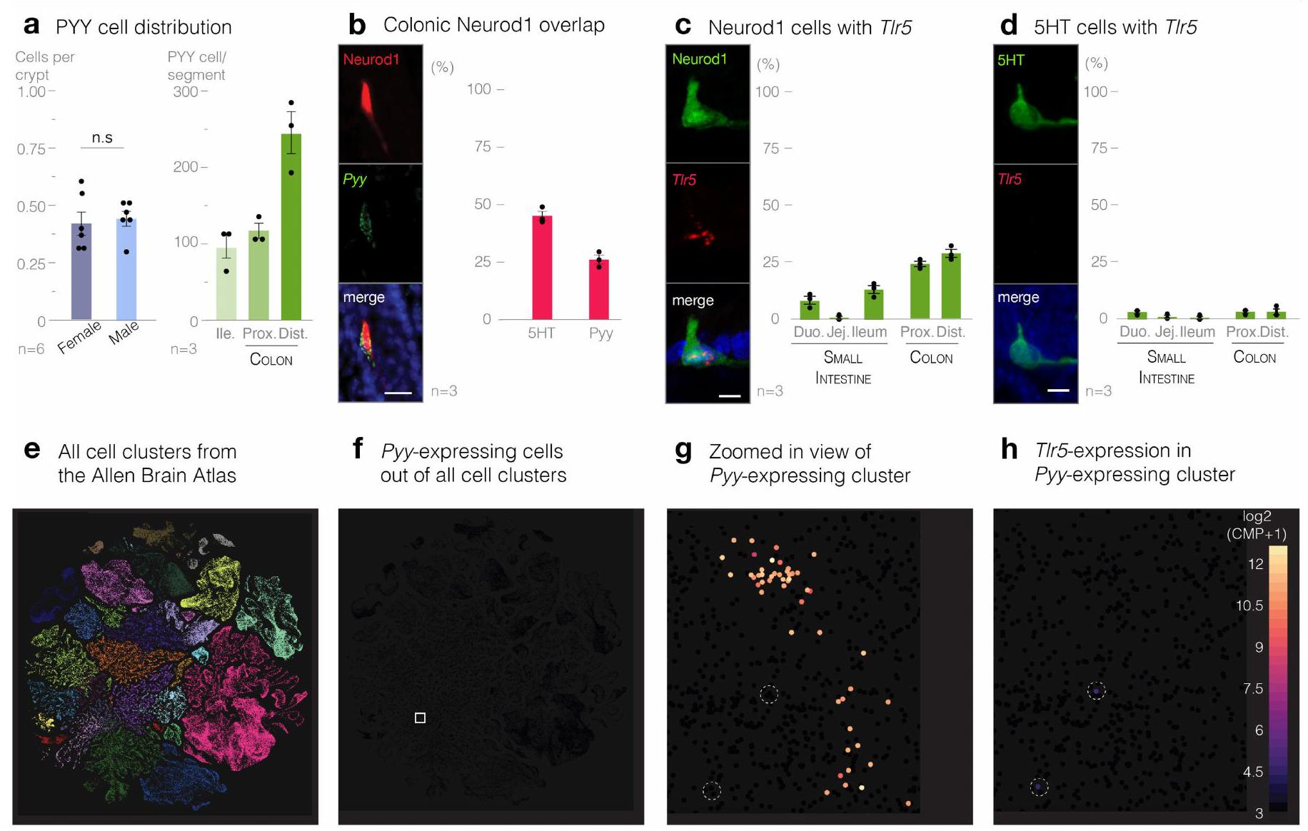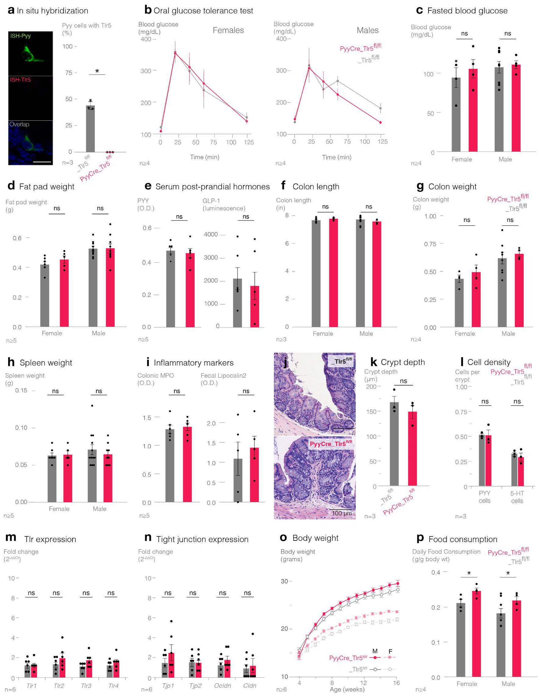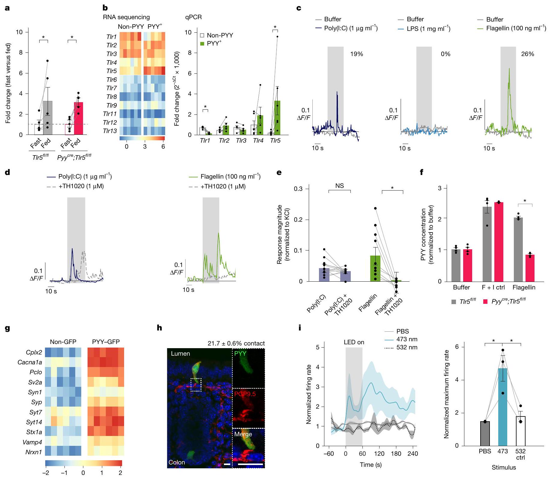 تم تأكيد التعبير القوي لـ Tlr5 في الخلايا المعلّمة بـ PYY باستخدام تقنية الهجين في الموقع. بشكل عام، زادت التوطين المشترك بشكل ملحوظ من