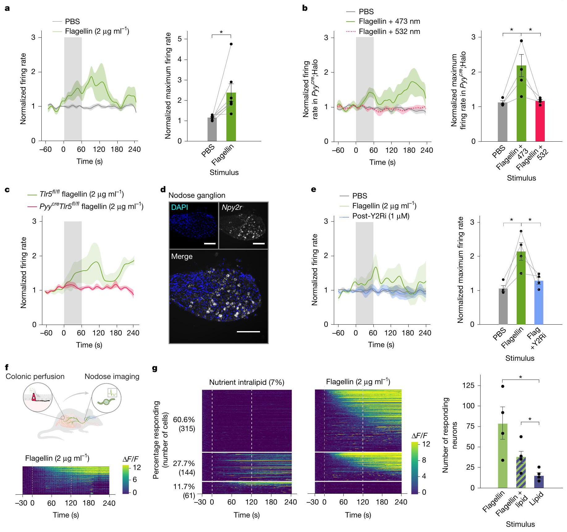 - For vagal nerve recordings: Throughout experiments, intralipid response was used as a positive control. For all flagellin and laser stimulation conditions, data were excluded if a stable intralipid response was not seen throughout the recording session.