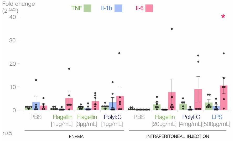 - In enema experiments, all included mice received a PBS stimulus, a flagellin stimulus, and in pharmacology experiments, mice received both PBS and flagellin stimuli in combination with pharmacological treatment. The order of stimulus delivery was randomized among different mice. This excludes germ-free mice, in which PBS was delivered first for minimizing bacterial colonization. Each stimulus delivery was separated by at least 48 hours from previous stimulus delivery.