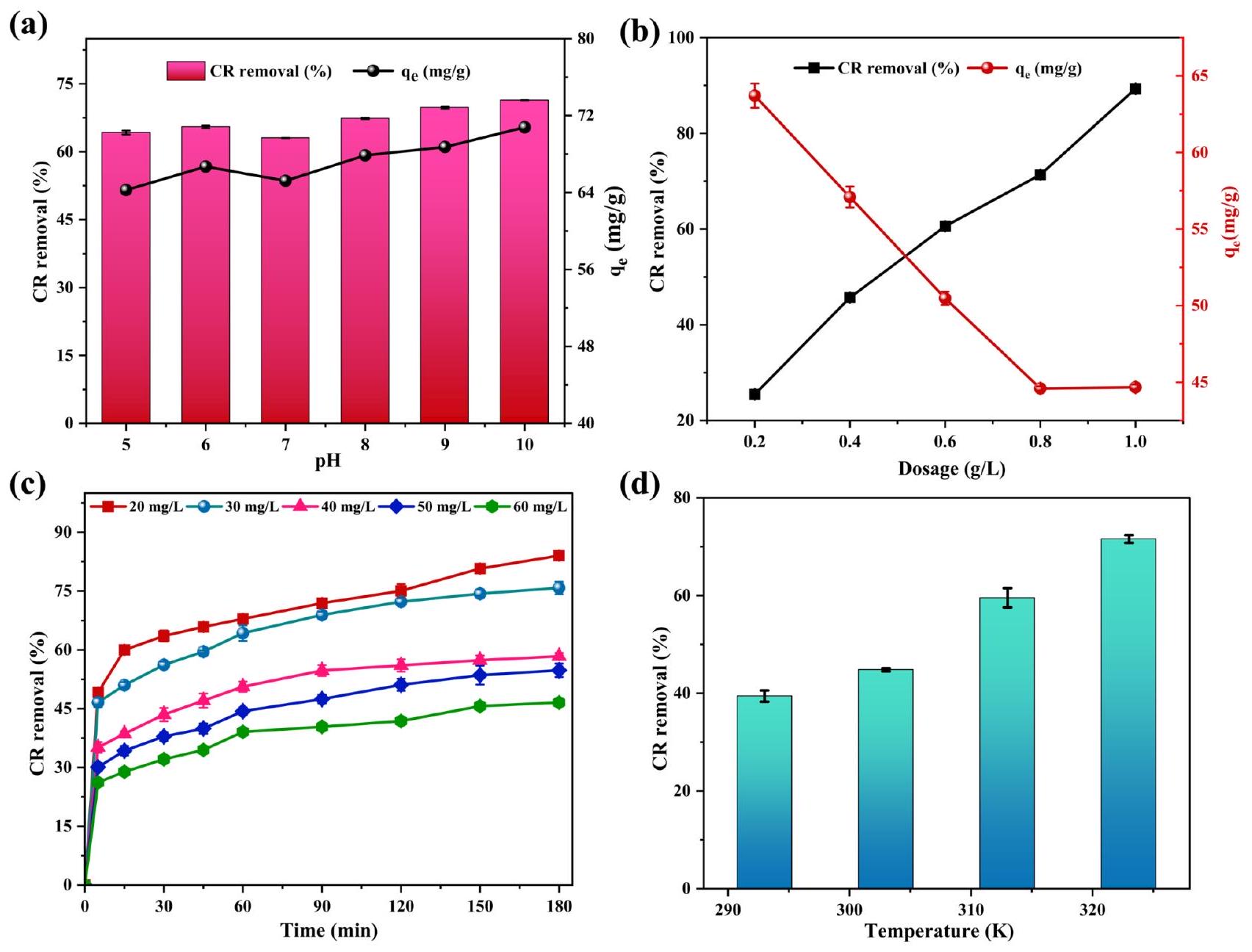 ، باستخدام الرقم الهيدروجيني والجرعة المثلى. بالإضافة إلى هذه المعايير، تم تقييم تأثير درجة الحرارة أيضًا. تم تغيير درجة الحرارة بين 293 و 323 كلفن تحت الرقم الهيدروجيني المثالي، والجرعة، وتركيز CR لتقييم تأثيرها على إزالة CR. خلال جميع التجارب، كانت الخلائط تهتز باستمرار (
