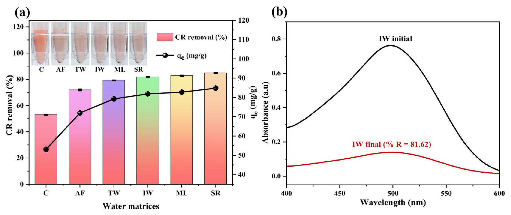 Fig. 8. (a) CR adsorption performance using SCAC across different water matrices including, Control (C), Arabi falls (AF), Tap water (TW), Industrial groundwater (IW) Manipal lake (ML) and Suvarna river (SR); (b) UV-visible spectra of CR removal performance using SCAC in Industrial groundwater (IW).
