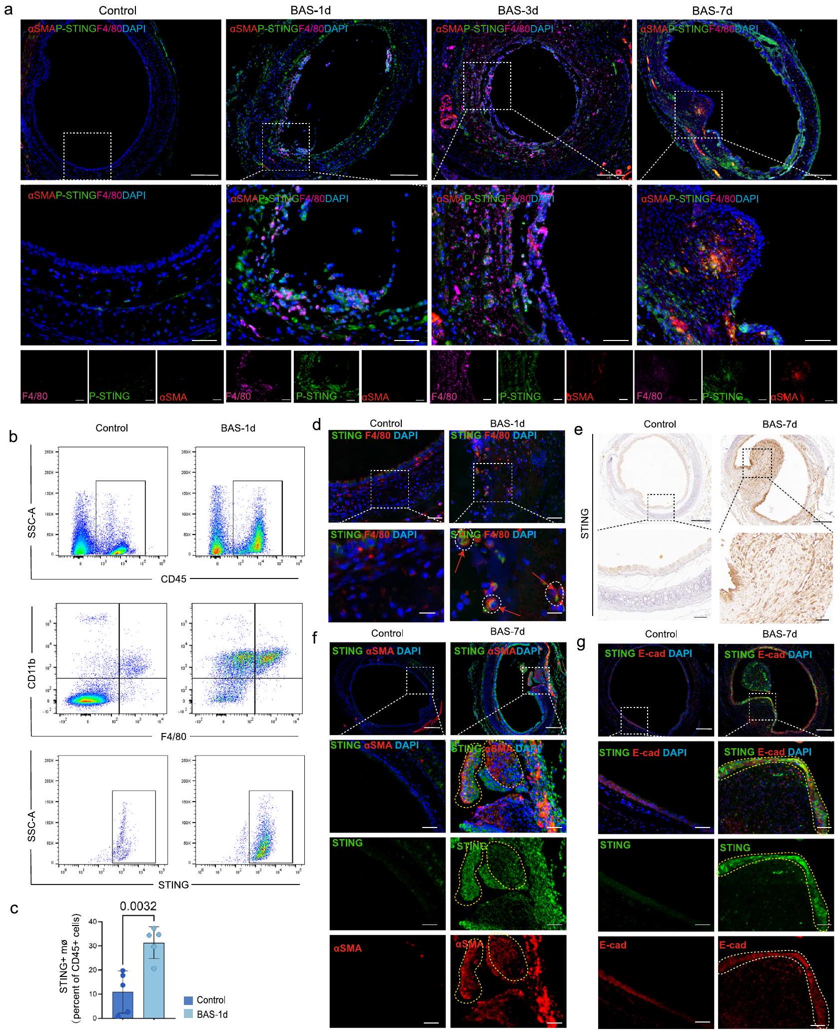 إطلاق الحمض النووي مزدوج الشريطة (dsDNA) من الخلايا التالفة أو الميتة هو حدث رئيسي في بدء استجابة التهابية. تضيق مجرى الهواء الحميد هو حالة مرضية تتميز بالتهاب حاد ومزمن نتيجة تلف المجاري الهوائية المركزية الكبيرة الناجم عن إدخال أنبوب القصبة الهوائية أو وضع دعامة قصبية (الشكل التوضيحي 1). بعد غسل القصبات الهوائية بالمنظار في المرضى الذين يعانون من تضيق مجرى الهواء الحميد، كان محتوى dsDNA في سائل غسل القصبة الهوائية مرتفعًا بشكل ملحوظ في المرضى مقارنة بالمجموعة الضابطة (الشكل 2a، b). لتحديد دور مسار cGAS-STING في BAS، تم إنشاء نموذج لـ BAS باستخدام فرشاة لإحداث تلف في القصبة الهوائية للفئران (الشكل 2c). كشفت النتائج النسيجية أن الفئران في المجموعة الضابطة كانت لديها قصبة هوائية مفتوحة مع ظهارة سليمة وبدون تسلل خلايا التهابية أو تكاثر نسيج حبيبي (الشكل 2d). بالمقابل، في مجموعة BAS، أظهر منطقة الإصابة الميكانيكية درجات متفاوتة من التضيق وتكاثر حبيبي ملحوظ، مع تكاثر خلايا الظهارة القصبية، وتسلل واسع للخلايا الالتهابية، وتكاثر مفرط، وعدم تنظيم في الخلايا الليفية، وزيادة في تكوين الأوعية الدموية الجديدة، وتراكم مفرط لمصفوفة خارج الخلية، مما أدى إلى زيادة سمك الغشاء الأساسي (LP) (الشكل 2d). من الجدير بالذكر أن سمك LP كان أكبر في مجموعة BAS مقارنة بالمجموعة الضابطة (الشكل 2e). تم جمع أنسجة القصبة الهوائية للفئران في نقاط زمنية مختلفة لتسلسل النسخ. أظهر تحليل علم الأحياء الجيني (GO) للنسخ في القصبة الهوائية أن المظاهر السائدة تشمل الاستجابة الالتهابية الناتجة عن الإصابة، وتنشيط الجهاز المناعي، وعمليات بيولوجية متنوعة مرتبطة بالحمض النووي في فترة الـ 24 ساعة الأولى بعد كشط القصبة الهوائية (الشكل التوضيحي 2a). ومع ذلك، في اليوم السابع بعد النمذجة، كانت أنسجة القصبة الهوائية بالفعل في حالة إصلاح، تتكون أساسًا من تجديد الظهارة الشعرية للقصبة الهوائية، وإعادة تشكيل المصفوفة خارج الخلية وإنتاج نسيج حبيبي ليفي (الشكل التوضيحي 2b)، مما يشير إلى أن القصبة الهوائية للفئران المكسورة مرت بعملية فسيولوجية تتماشى مع نمو الساركومير. علاوة على ذلك، في المرحلة المبكرة من BAS، يتم تنشيط العديد من الوظائف الجزيئية المتعلقة بالحمض النووي في القصبة الهوائية للفئران. أظهرت العديد من الدراسات الآن أن الحمض النووي يمكن أن ينشط الاستجابة المناعية.. لذلك، قامت الدراسة الحالية بتقييم وجود الحمض النووي مزدوج الشريطة (dsDNA) في القصبات الهوائية الضابطة والمصابة، مما كشف أن محتوى dsDNA في سائل غسل القصبة الهوائية في مجموعة BAS كان أكبر بكثير من المجموعة الضابطة (الشكل 2f). علاوة على ذلك، أظهر تحليل IF أن كشط القصبة الهوائية أدى إلى تسرب ملحوظ للـ dsDNA السيتوزولي في القصبة الهوائية (الشكل 2g). أظهر تحليل مسار Kyoto Encyclopaedia of Genes and Genomes (KEGG) للجينات المعبر عنها بشكل مختلف (DEGs) أن مسار استشعار الحمض النووي السيتوزولي تم تنشيطه بشكل كبير في BAS بعد 24 ساعة من إصابة القصبة الهوائية (الشكل 2h). كما هو موضح في خريطة الحرارة للجينات الرئيسية المعبر عنها بشكل مختلف، كانت الجينات المتعلقة بمسار استشعار الحمض النووي السيتوزولي معبرة بشكل كبير بعد 24 ساعة من إصابة القصبة الهوائية في مجموعة BAS مقارنة بالمجموعة الضابطة (الشكل 2i). أظهر تحليل Western blot أن تعبير cGAS،