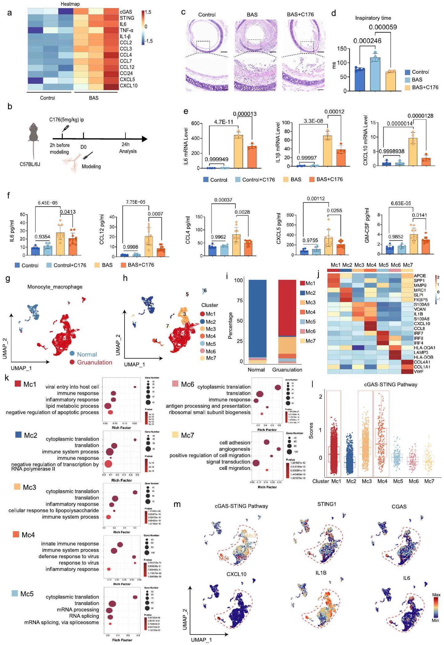 في الوقت الحاضر، العلاج السريري الرئيسي لمرض التهاب الشعب الهوائية الحاد هو إزالة نسيج التندب تحت التنظير القصبي، ولكن هذا يمكن أن يسبب تضيقًا ثانويًا. لذلك، قد يكون التدخل المبكر فعالًا في تخفيف تكاثر نسيج التندب. أظهرت الدراسة الحالية أن STING تم التعبير عنه في المرحلة الالتهابية الحادة المبكرة من BAS وفي المرحلة الالتهابية المزمنة اللاحقة (فرط تنسج التندب). وقد أظهرت الدراسات أن STING مرتبط بقوة بالالتهاب.كما هو موضح في خريطة الحرارة للجينات المعبر عنها بشكل مختلف (DEGs)، كانت جينات STING والالتهابات معبرة بشكل كبير بعد 24 ساعة من إصابة القصبة الهوائية في الفئران المعالجة. مقارنةً بالفئران الضابطة (الشكل 5أ). للتحقيق في دور STING في المرحلة الالتهابية من تضيق مجرى الهواء، تم علاج الفئران بـ C176 (الشكل 5ب). مقارنةً بتلك الخاصة بمجموعة BAS المعالجة بـ PBS، تحسنت أعراض الصفير في مجموعة BAS المعالجة بـ C176 خلال المرحلة الالتهابية من تضيق مجرى الهواء، وأظهرت نتائج صبغة HE أن درجة الوذمة الالتهابية في مجاري الهواء لمجموعة BAS المعالجة بـ C176 قد تحسنت أيضًا (الشكل 5ج). في المرحلة الالتهابية المبكرة، تسبب إصابة مجرى الهواء في التهاب وذمة مجرى الهواء، مما أدى إلى تضيق القصبة الهوائية والصفير.