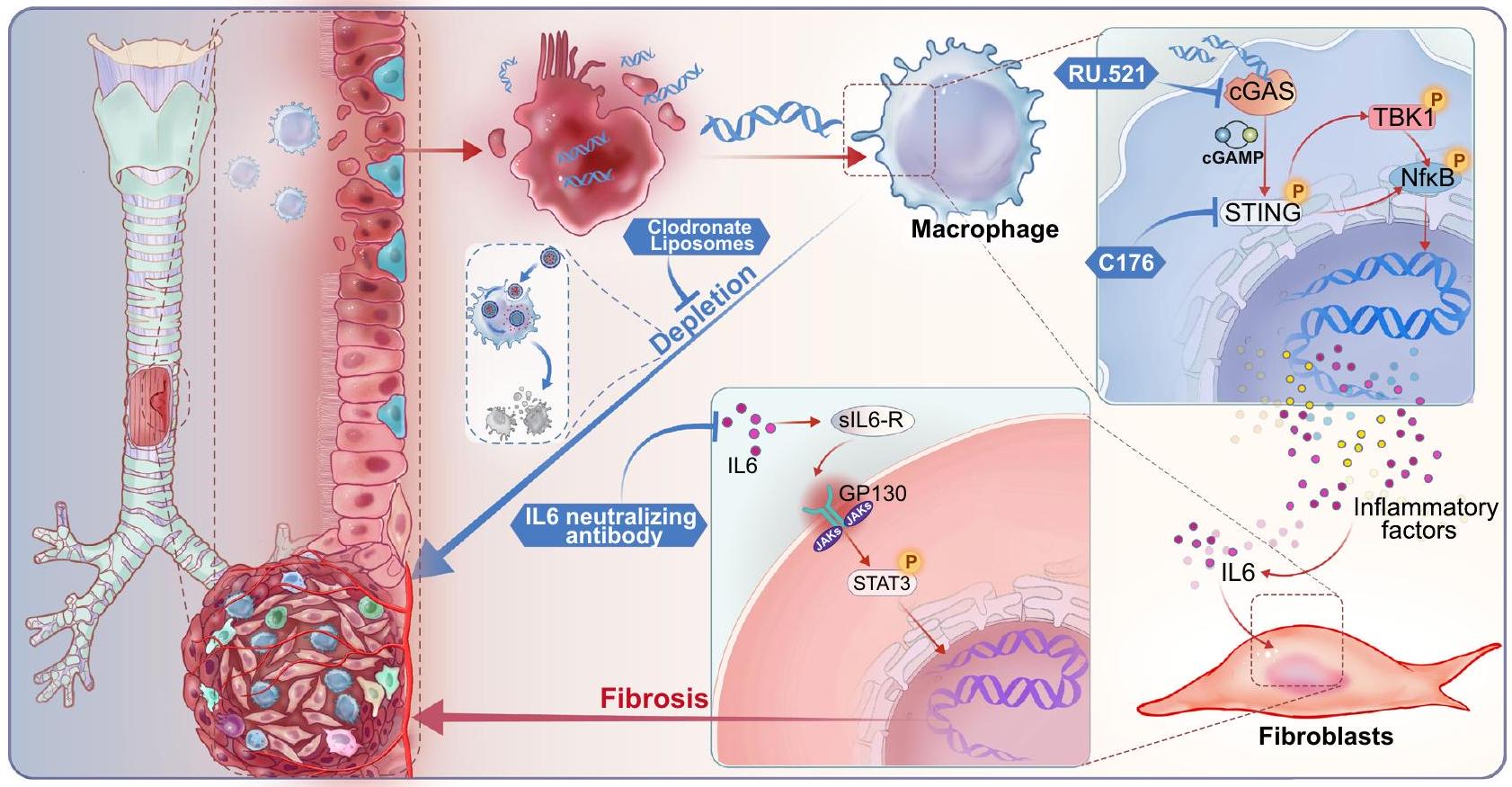 fibroblasts, contributing to the fibrosis of granulation tissue. Treatment with the cGAS inhibitor RU.521, the STING inhibitor C176, or IL-6 neutralizing antibody alleviates granulation tissue fibrosis. Additionally, depletion of macrophages using bisphosphonate liposomes reduces the extent of fibrosis in the granulation tissue.