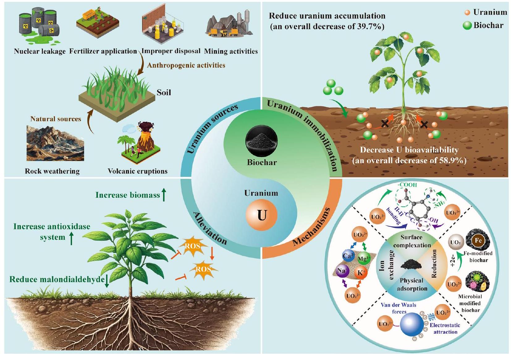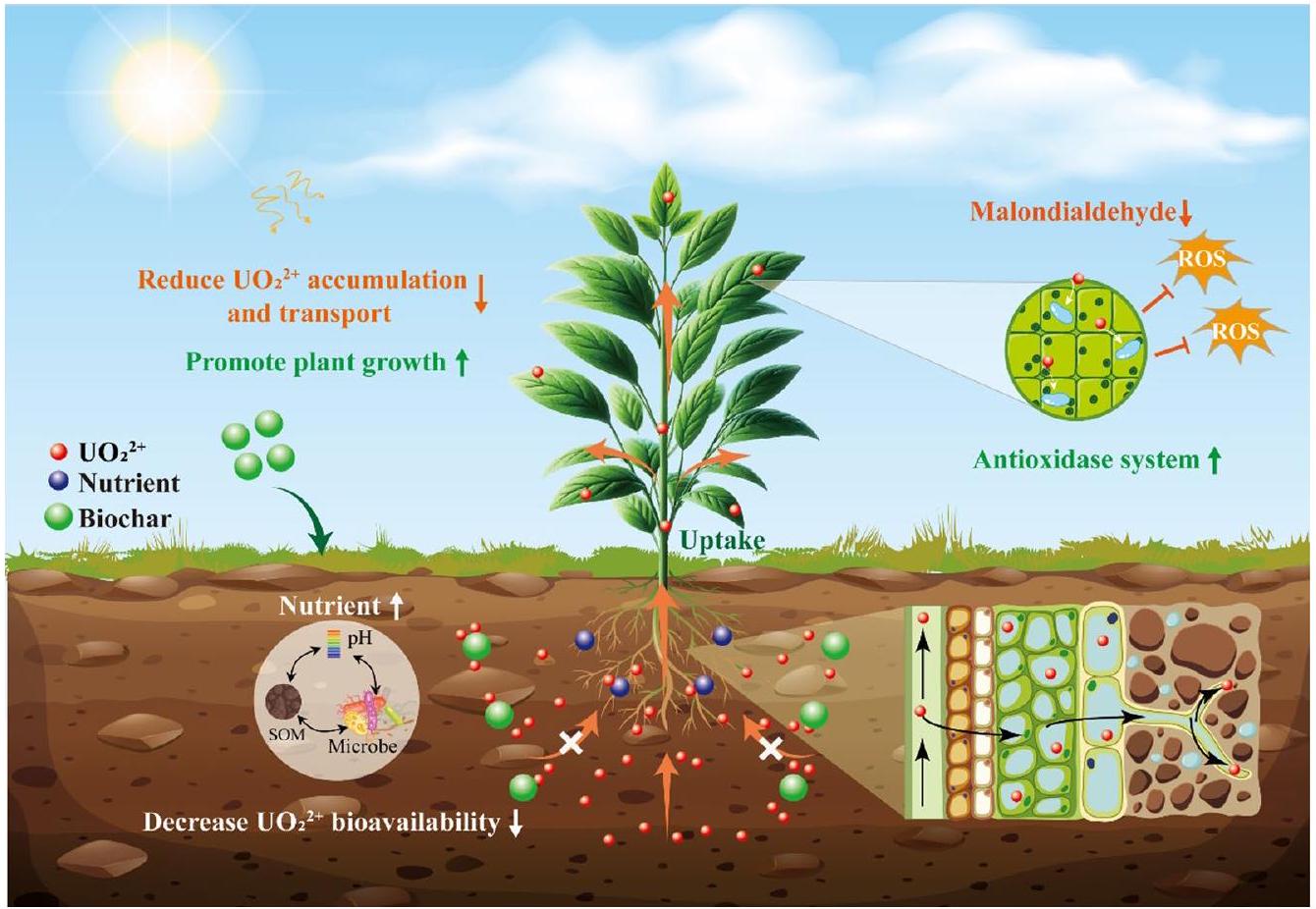 تكتسب النباتات اليورانيوم بشكل أساسي من خلال الانتشار السلبي، والنقل الميسر، أو آليات الامتصاص النشطة، والتي تحدث بشكل رئيسي من خلال نظام الجذور (تشين وآخرون 2021؛ لاي وآخرون 2021). بمجرد امتصاصه، يمكن نقل اليورانيوم إلى الأجزاء الهوائية من النبات، مما قد يؤدي إلى السمية وآثار سلبية على النمو والتطور (تسوي وآخرون 2023). يلعب البيوكربون دورًا حاسمًا في منع هجرة اليورانيوم في أنظمة التربة والنبات