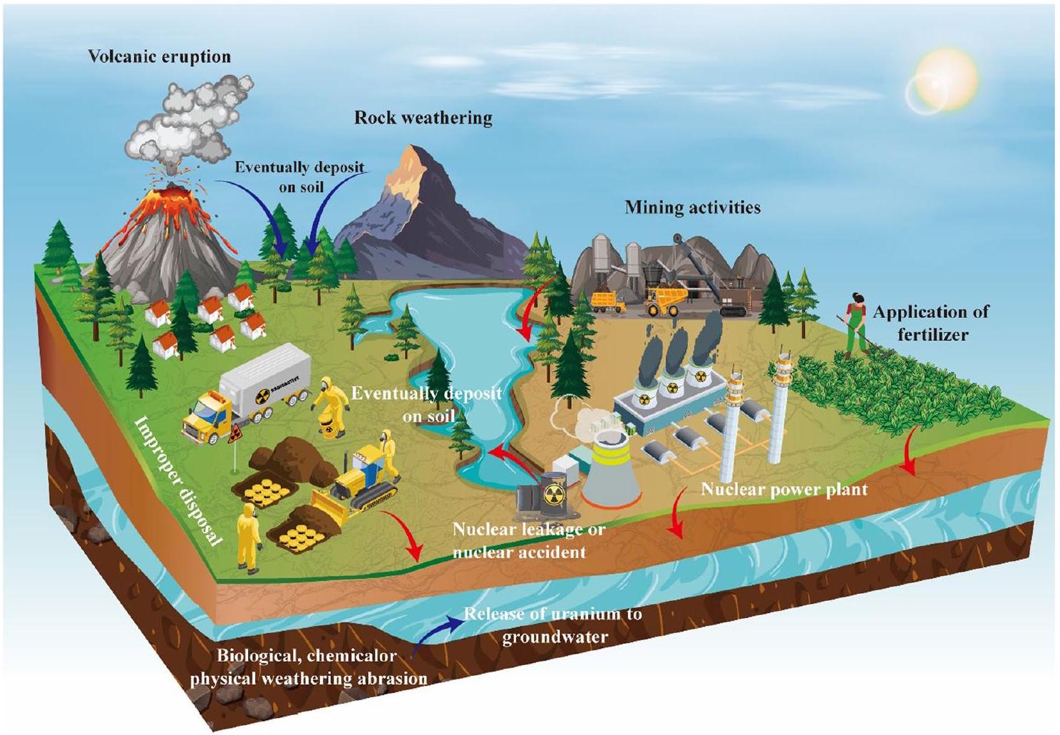 العمليات الجيولوجية، والأنشطة البشرية، والتجوية الطبيعية، وكلها تؤثر بشكل كبير على أنظمة التربة والنبات على مسافات كبيرة (بيريز-سانشيز وثورن 2014). نظرًا لسميته الكيميائية والإشعاعية، يشكل اليورانيوم مخاطر كبيرة على نمو النبات، وإنتاجية الزراعة، وسلامة الغذاء (سريفاستافا وآخرون 2020). علاوة على ذلك، يؤدي تراكم اليورانيوم بواسطة النباتات إلى نقله على طول سلسلة الغذاء، مما يؤثر في النهاية على صحة الإنسان، مع آثار محتملة على تطور السرطان عند مستويات تتجاوز