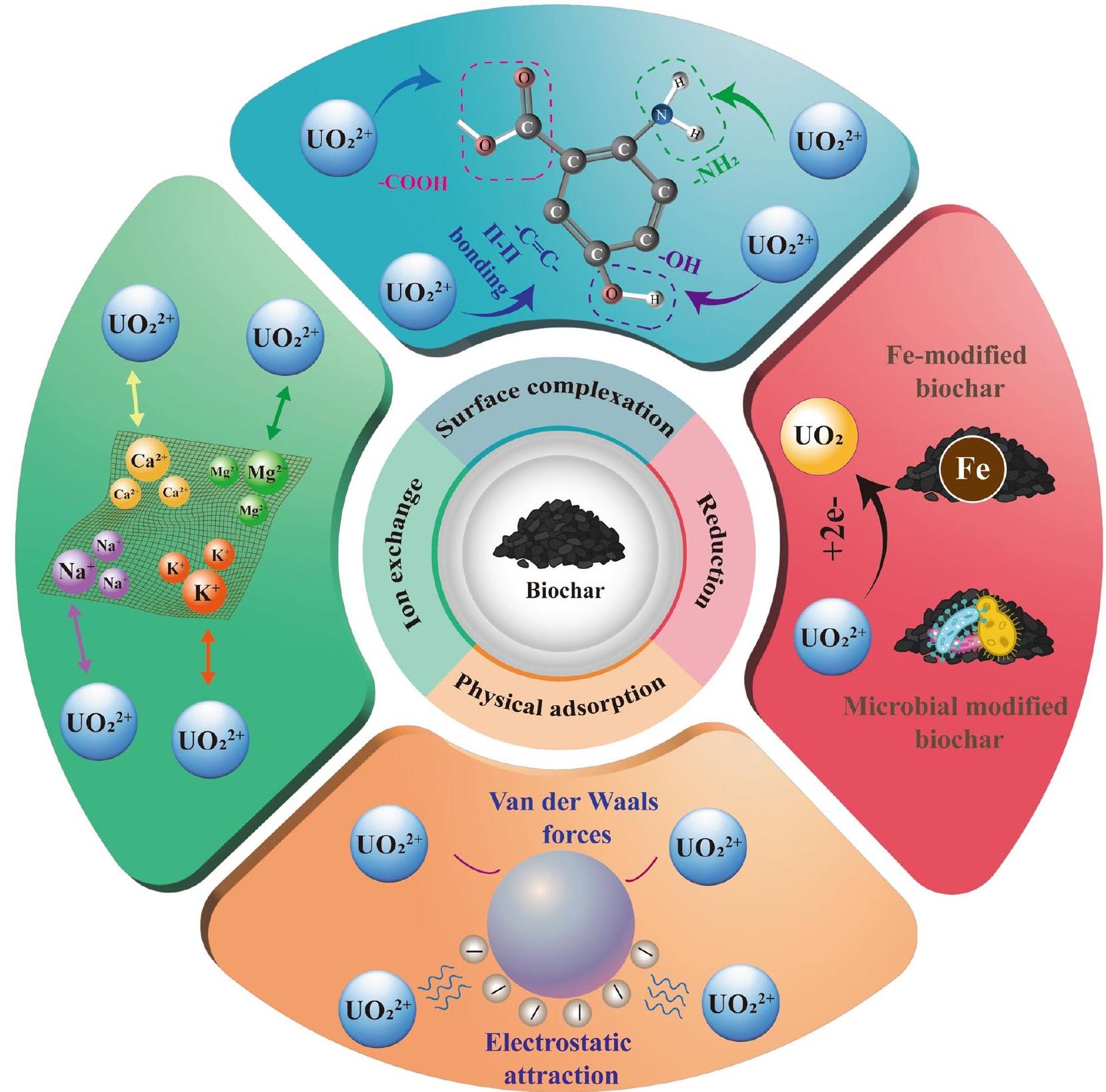 the formation of strong and stabilising complexes with uranyl ions (Dai et al. 2021a; Wu et al. 2022a; Gan et al. 2023; Li et al. 2023a). Ahmed et al (2021a) demonstrated the importance of -COOH and -OH groups in the sorption of uranyl ions onto biochar surface, indicating the presence of these groups significantly influences the sorption capacity. Similarly, Fu et al (2022) confirmed the important role of -COOH and -OH groups in the formation of complex surface bonds, effectively which effectively reduces the mobility and bioavailability of uranium in the soil. Additionally, though the literature is limited, some reports indicated the involvement of aromatic groups in the complexation process through the formation of