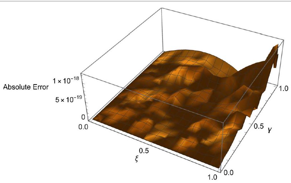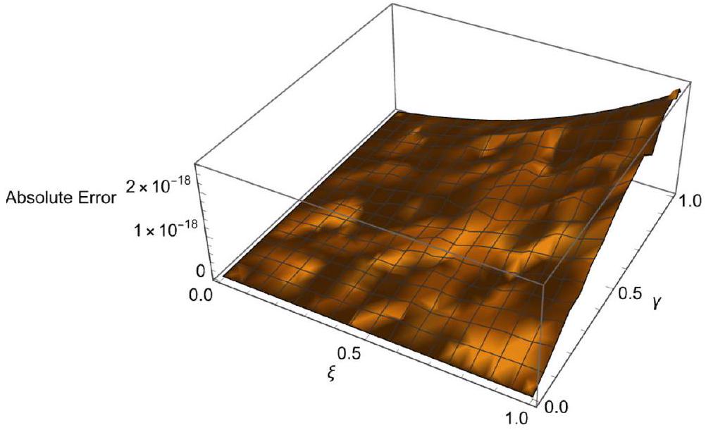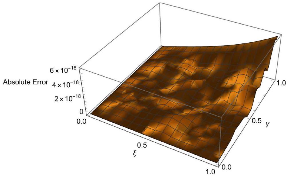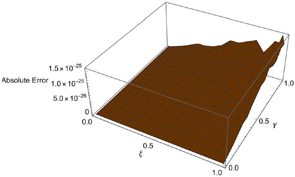 in [35] ( ) with and to obtain the maximum absolute errors. Table 13 presents the theoretical errors for different values of , and . Figure 3 shows the action of AE for , and .