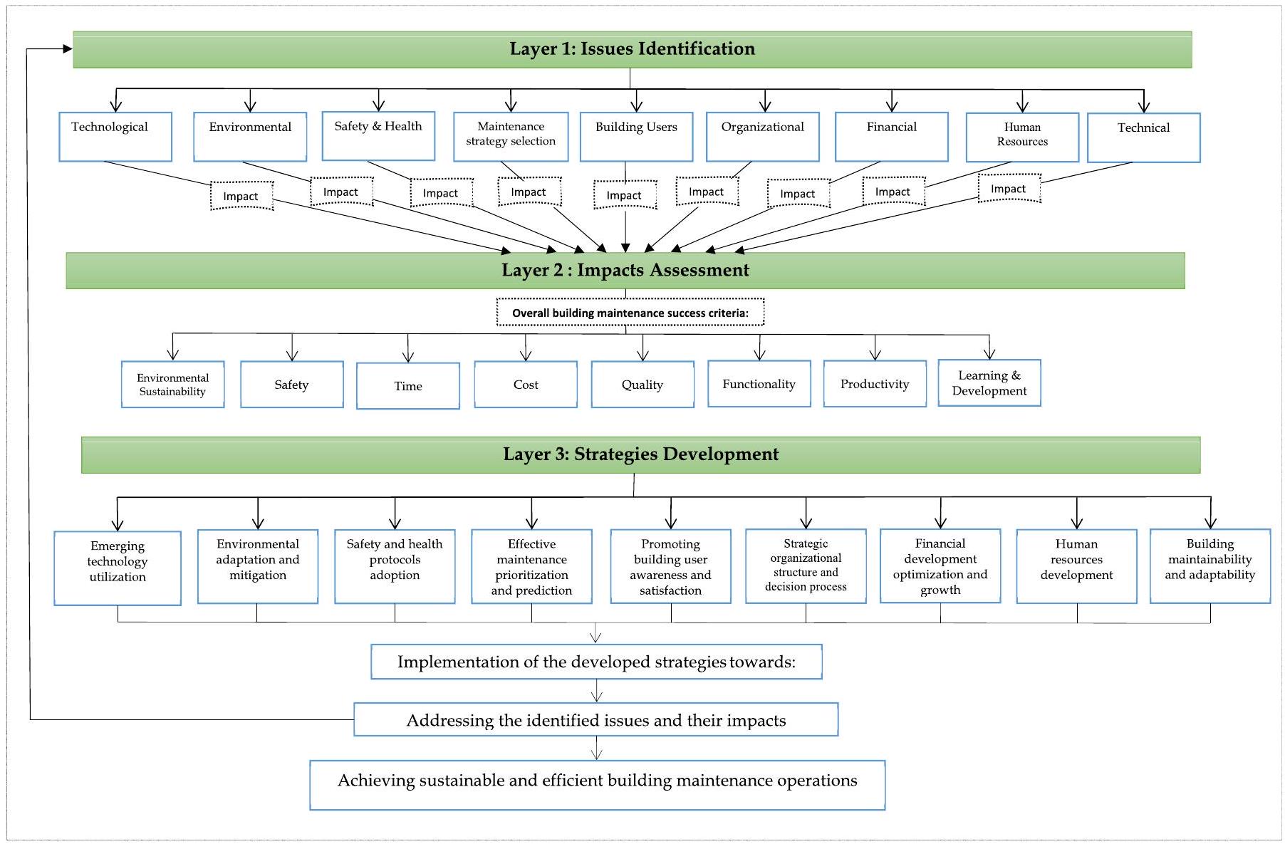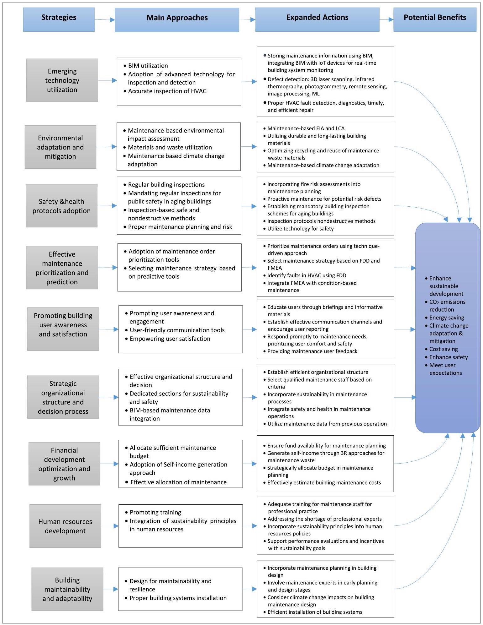 emissions. Further, it has highlighted the potential benefits of upgrading building systems to enhance the efficiency and performance of building energy. Besides, it has explained how building maintenance has been or will be affected by climate change impacts by identifying the potential impacts as well as avenues to adapt to this challenge. - SDGs: This study has demonstrated the vital role of sustainable and efficient building maintenance operations in existing buildings in contributing to the achievement of a number of United Nations SDGs. To begin with, implementing efficient maintenance of aging buildings that consume large amounts of energy and impact the surrounding environment through maintenance decisions based on environmental impact assessments aligns with SDG 13: climate action. Also, it supports SDG 11 by emphasizing the importance of wellmaintained buildings that contribute to sustainable urban development, which aligns with SDG 11: sustainable cities and communities. Additionally, the utilization of emerging technologies in building maintenance operations advances SDG 9 by promoting innovative technologies that enhance safety, minimize environmental damage, and utilize automation tools such as nondestructive test inspection, which align with SDG 9: industry, innovation, and infrastructure. Lastly, it promotes the efficient utilization of resources throughout the entire maintenance process, which aligns with SDG 12: responsible consumption and production.