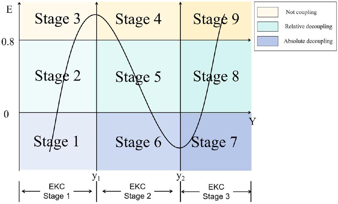 sample whose GDP per capita is higher than the first inflection point of the EKC have achieved strong decoupling. In other words, among the six two-dimensional decoupling stages corresponding to the second and third stages of EKC (Stage 4-9), 9 countries are in Stage 6, and 3 countries are in Stage