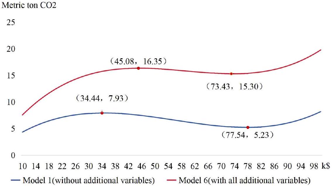 الشخص)، على التوالي. هذه النتيجة تختلف عن نقطة الانعطاف في EKC في النموذج 1. نحن نقارن بين منحنيات المعادلة التكعيبية التي تتوافق مع المعاملات المقدرة في الشكل 3 لمناقشة تأثير المتغيرات الضابطة على شكل EKC. يظهر الشكل 3 أنه بعد أخذ المتغيرات الضابطة في الاعتبار، لم يتقلص فقط الفضاء الاقتصادي بين نقطتي الانعطاف من 43.10 ألف دولار أمريكي إلى 28.35 ألف دولار أمريكي، ولكن أيضًا انخفضت انبعاثات الكربون للفرد بين نقطتي الانعطاف من حوالي 2.70 طن متري إلى حوالي 1.05 طن متري. وهذا يشير إلى أن EKC يبدو أنه ينحني لأعلى عند محاولة حساب متغيرات تفسيرية أخرى. ونتيجة لذلك، فإن الجزء الوحيد المتناقص من منحنى انبعاثات الكربون على شكل N قد تقلص في كل من “المدة” و”الفضاء المتناقص”، مما يكشف عن وضع أكثر حدة في التخفيف من تغير المناخ العالمي.