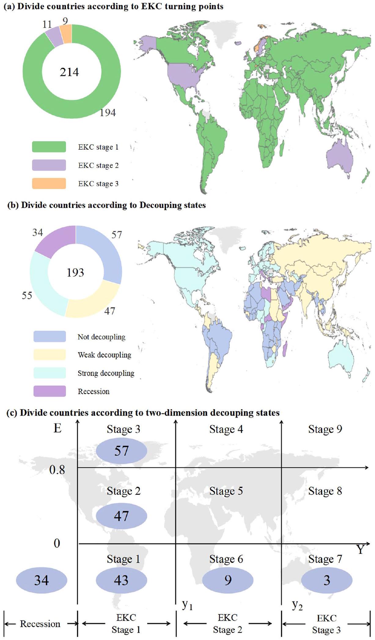 2 The number of countries belonging to the second and third stages of EKC in twodimensional decoupling in Fig. 4c is smaller than that in Fig. 4a. This is because some countries only have per capita GDP data but do not have enough carbon emission data in the past two decades.