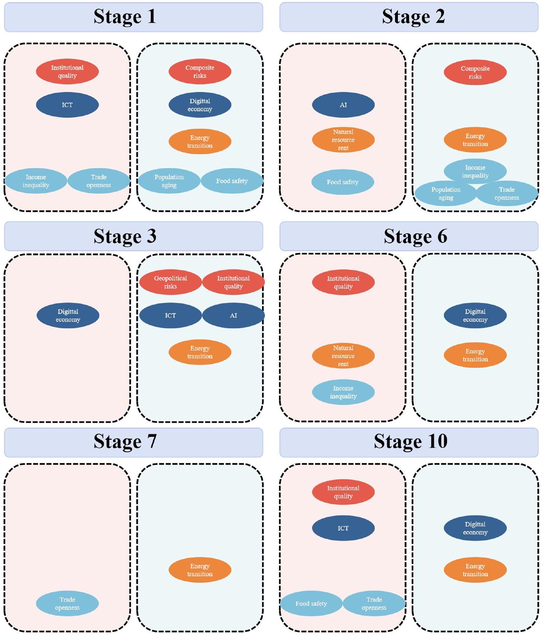 emissions, while digital technology reduces carbon emissions. It shows that these countries should pay attention to the carbon footprint issue of the ICT industry and encourage the penetration of ICT into other economic sectors to form a broader and deeper digital economic industry. In terms of resource utilization, the emission reduction effect of the energy transition is significant. Considering that the magnitude of the effect is not ideal, countries currently in Stage 1 should prioritize economic development and gradually deploy the production and utilization of clean energy in conjunction with economic development. In terms of social management, income inequality, and trade openness bring more carbon emissions, while population aging and food security reduce carbon emissions. It seems that, on the one hand, these countries should introduce fiscal and agricultural production policies to promote fair distribution of wealth and improve food production security (Akbar et al., 2019). On the other hand, they need to introduce more green products and technologies in the process of international trade or investment promotion (Qiang Wang et al., 2023b).